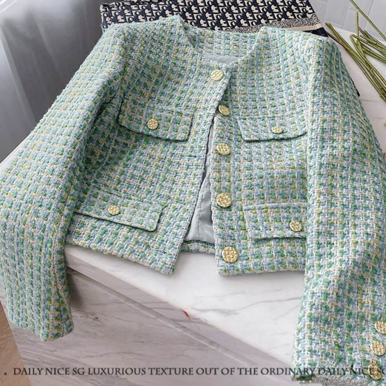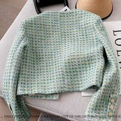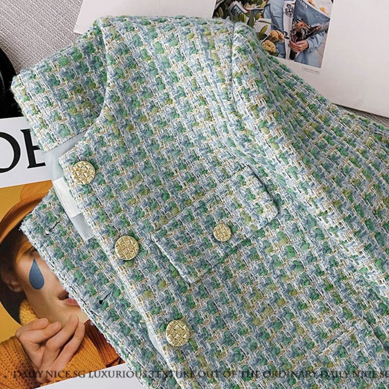 上品なツイード素材の千鳥格子柄が、大人の女性にふさわしいエレガントな雰囲気を演出します。