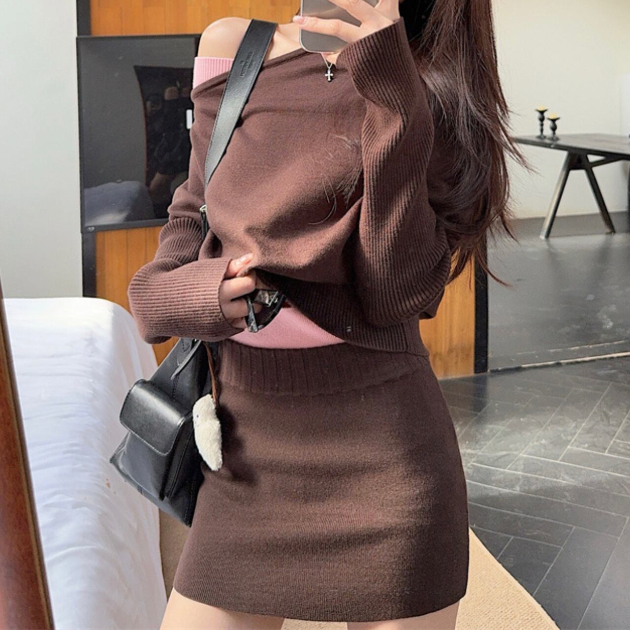 オフショルダーデザインが女性らしさを際立たせるニットトップスとミニスカートのセットアップ。ロングスリーブで肌寒い季節にも暖かく、上品なリブ編みが洗練された印象を与えます。デイリーユースはもちろん、ちょっとしたお出かけにもぴったりな、着回し力の高いアイテムです。
