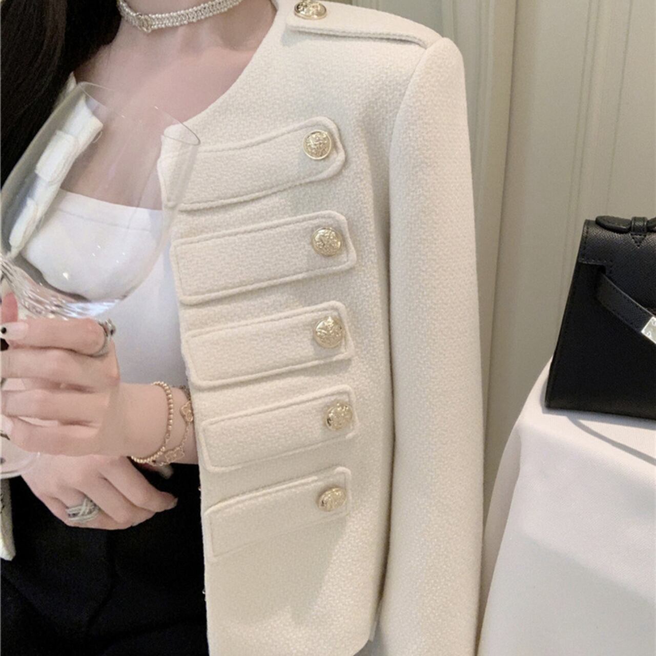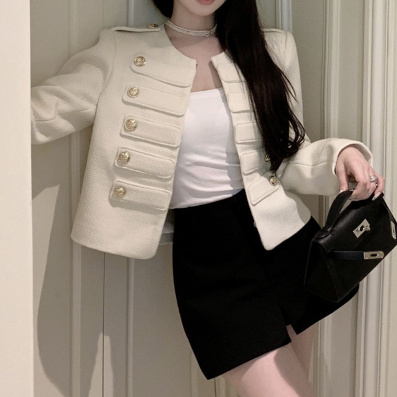 上品な印象を与えるミリタリージャケット。ゴールドボタンがさりげなく輝き、着るだけでクラスアップした着こなしが実現します。七分袖なので、春先や秋口など、気温の変化に対応しやすいのも嬉しいポイント。オンオフ問わず、幅広いシーンで活躍するアイテムです。