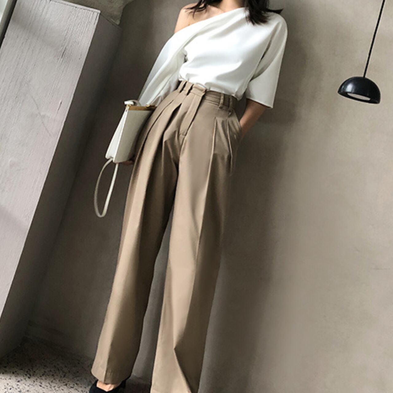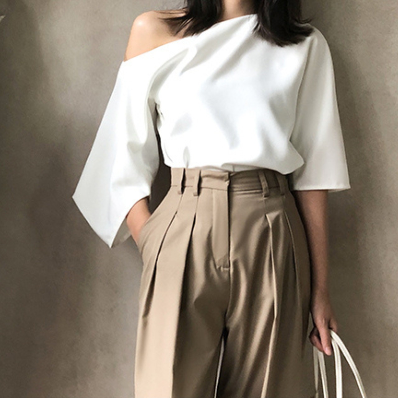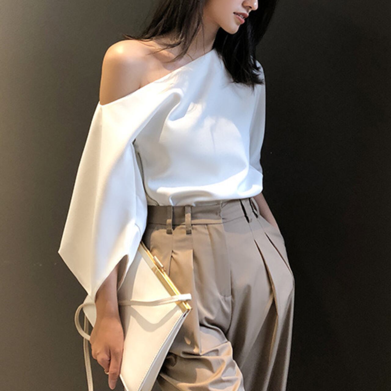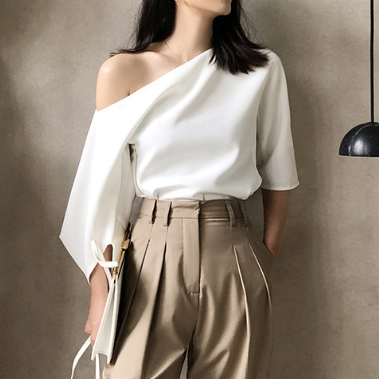 さりげなく個性を主張できる、ワンショルダーのアシンメトリーデザイントップス。