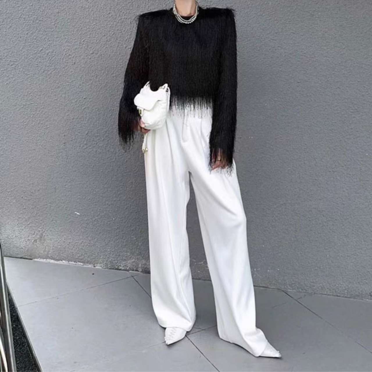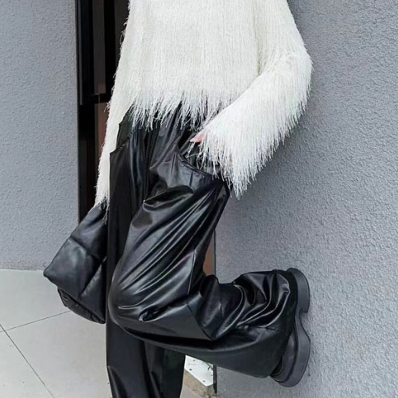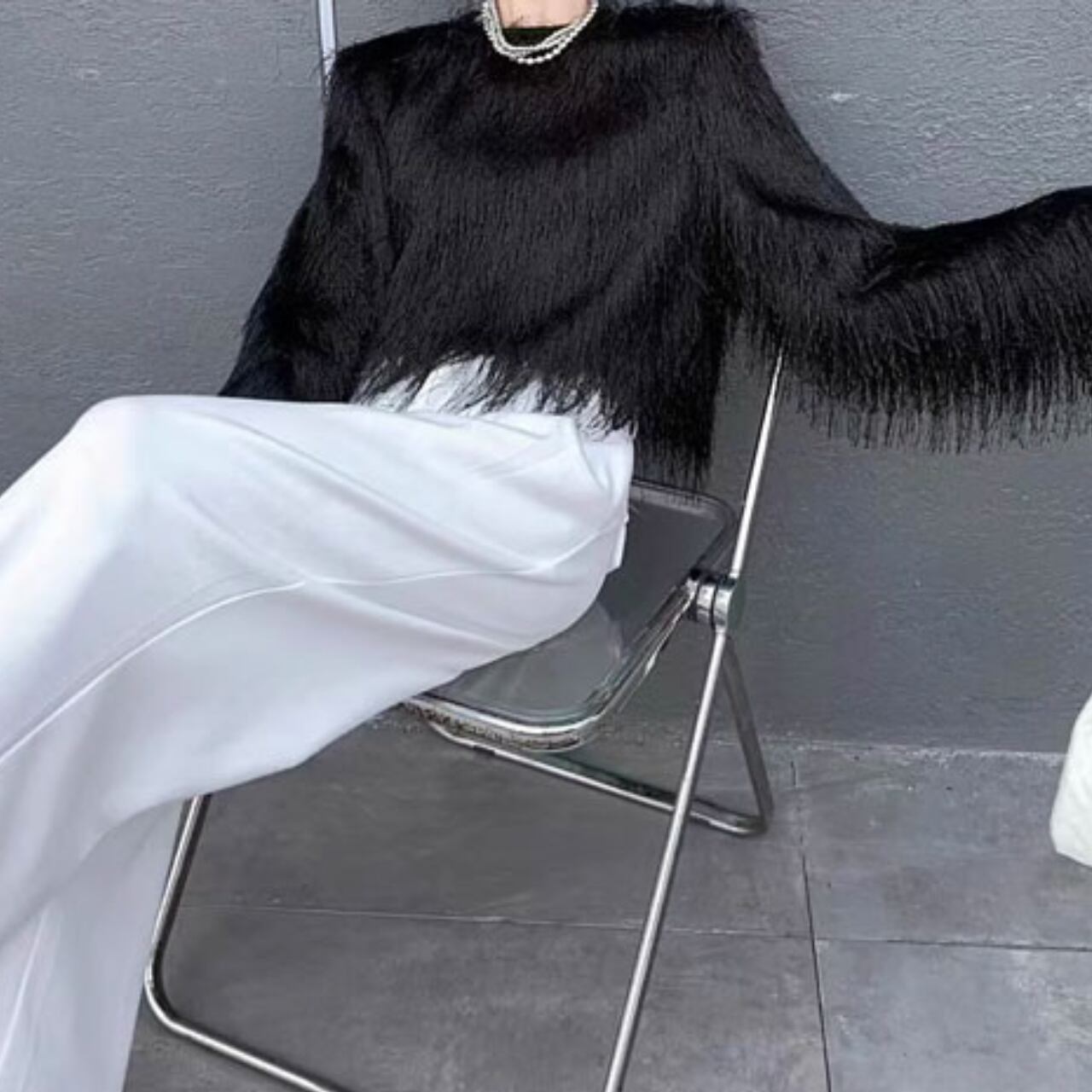 カジュアルなボトムスと合わせても、上品なスタイリングが完成します。