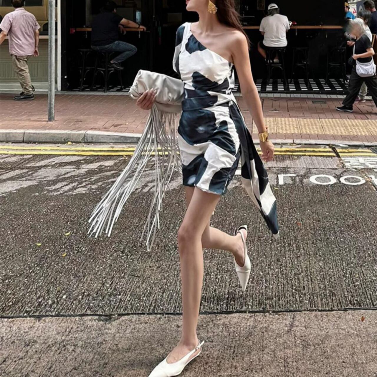 ワンショルダーのデザインが、女性らしい華奢な肩ラインを強調します。