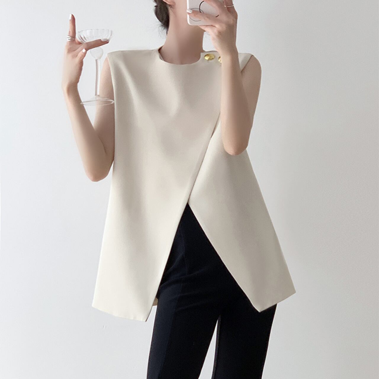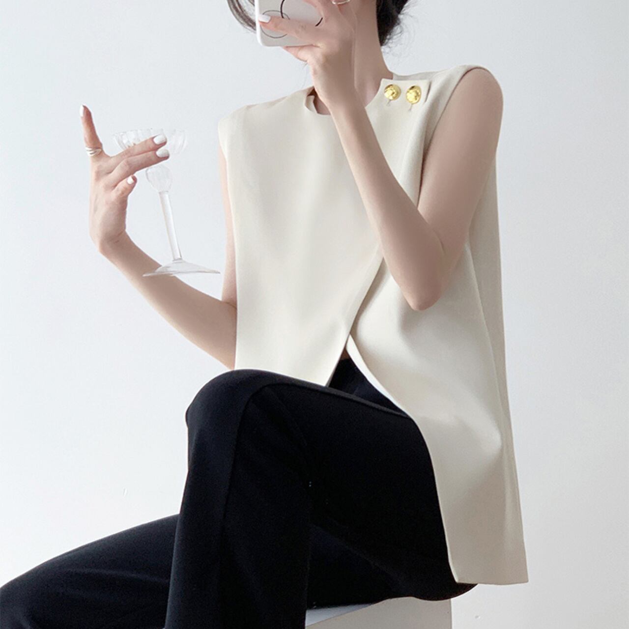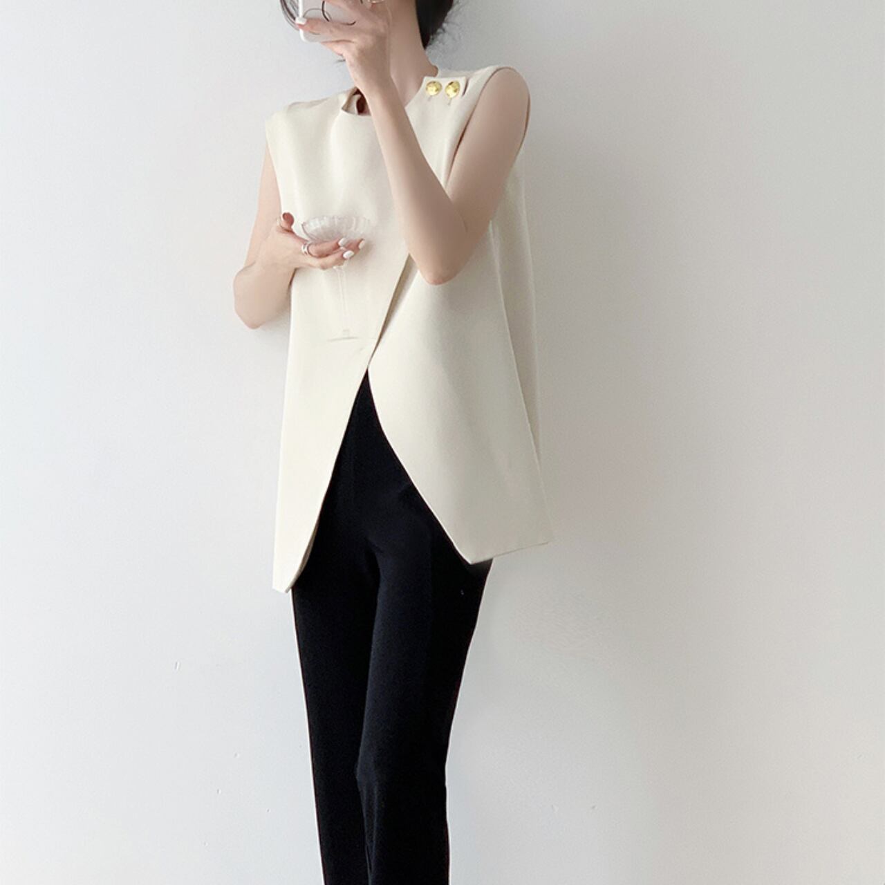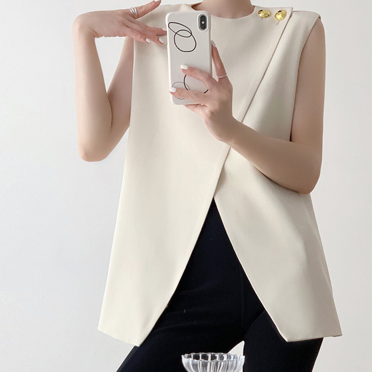 さりげないゴールドボタンがアクセントになった、ノースリーブトップス。