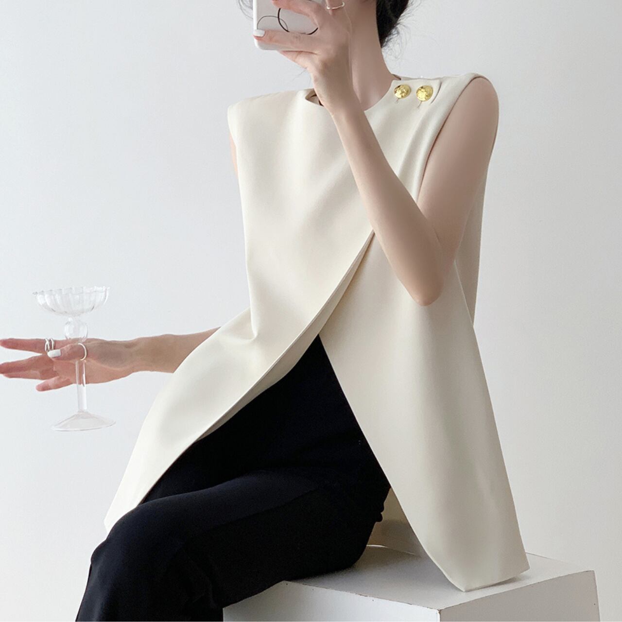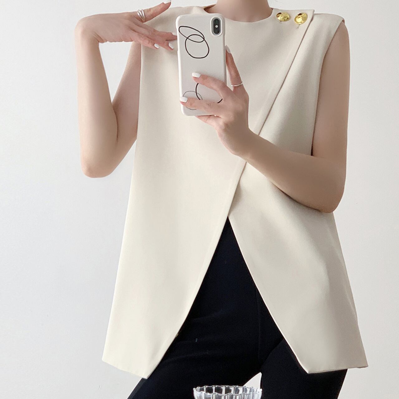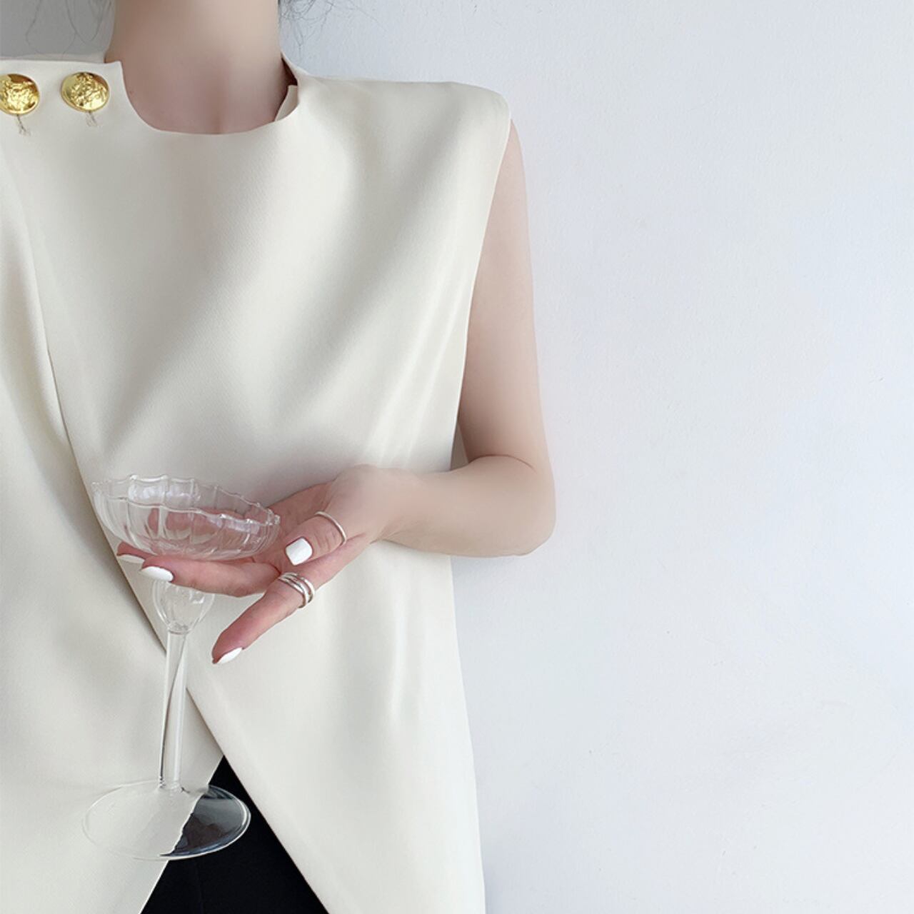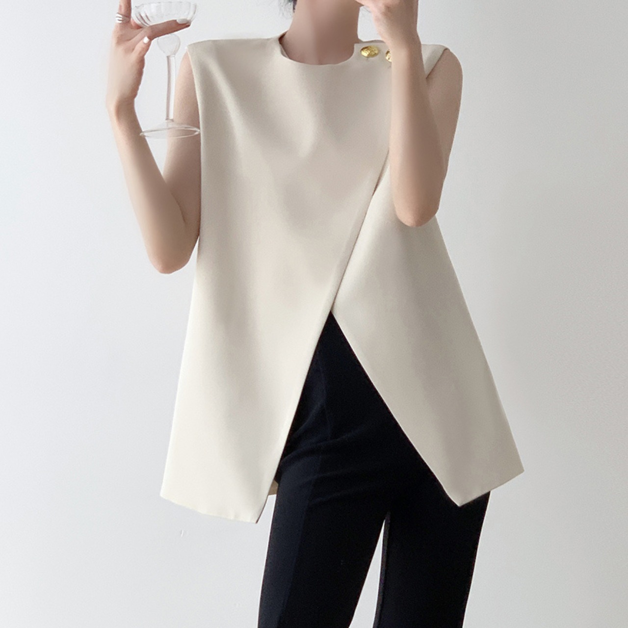 さりげないゴールドボタンがアクセントになった、ノースリーブトップス。