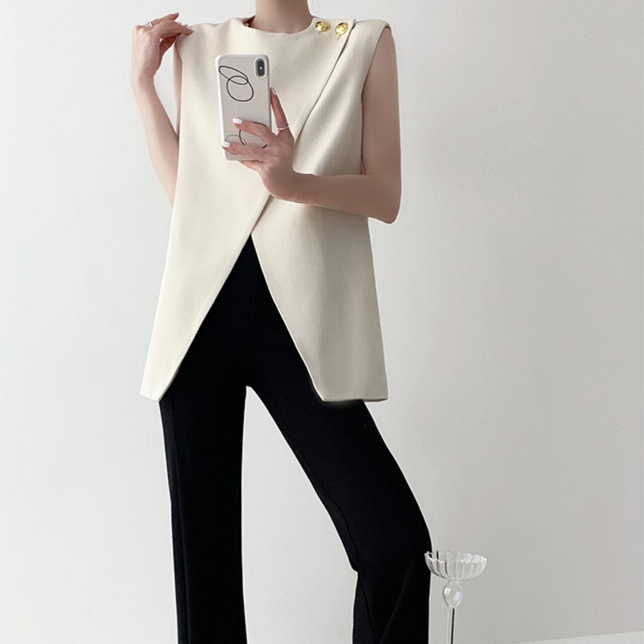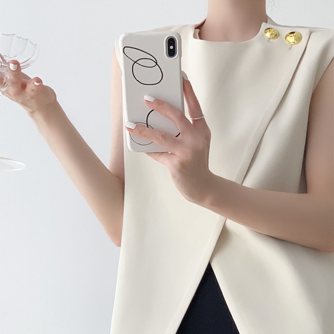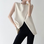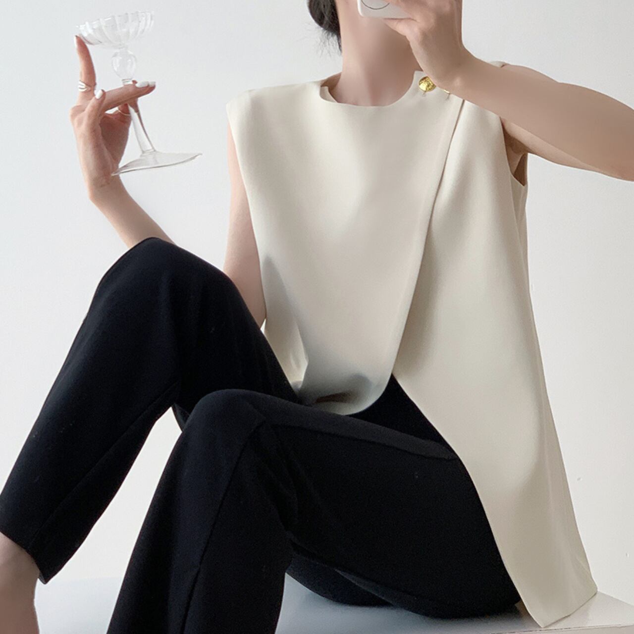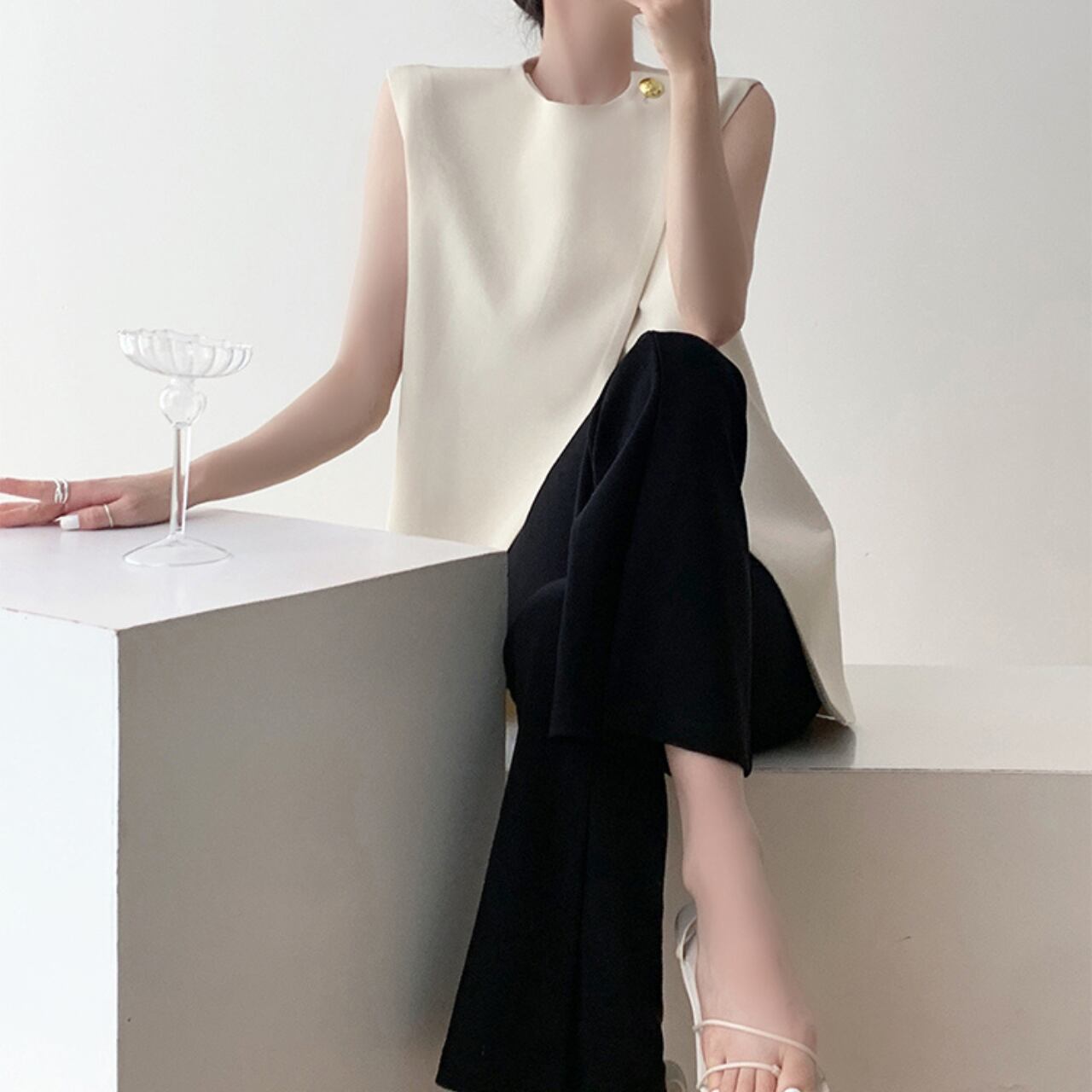 さりげないゴールドボタンがアクセントになった、ノースリーブトップス。
