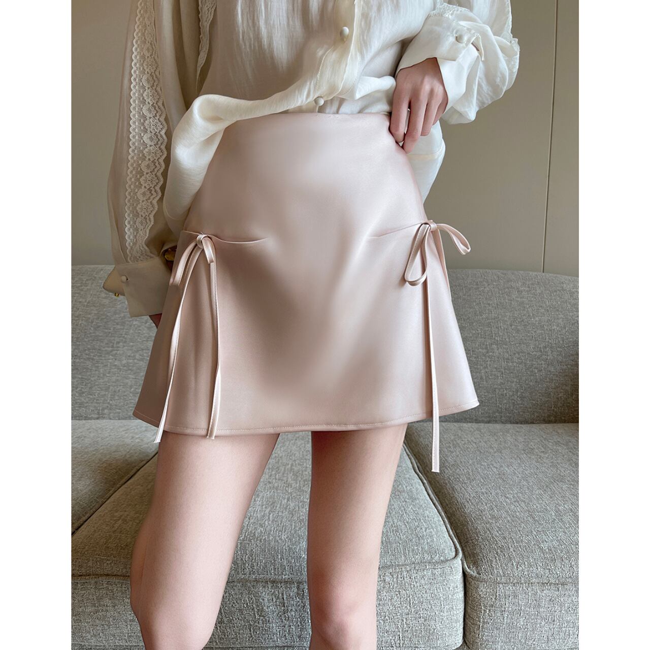 上品な光沢が魅力のミニスカート。