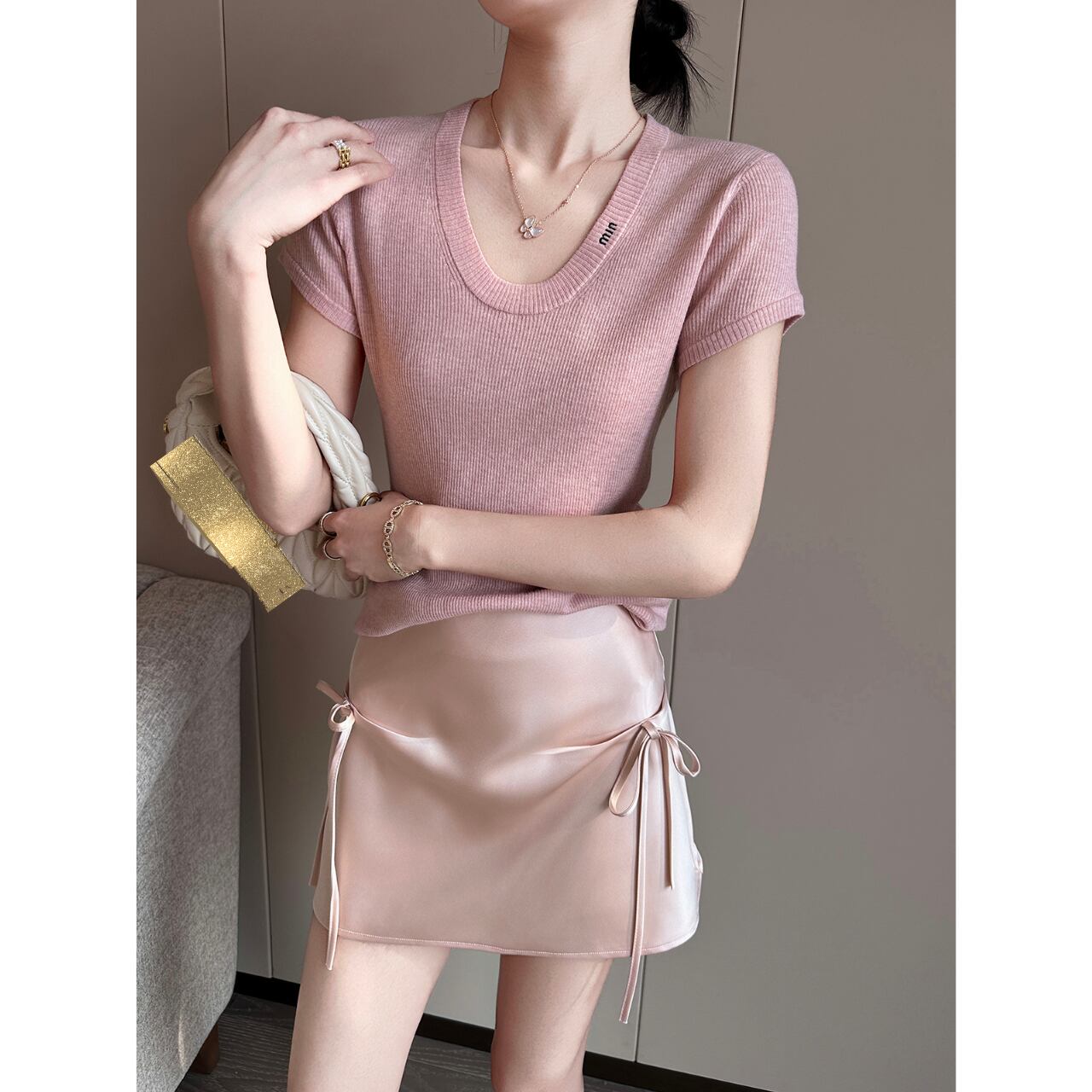サイドのリボンがさりげないアクセントとなり、シンプルなスタイルも華やかに彩ります。