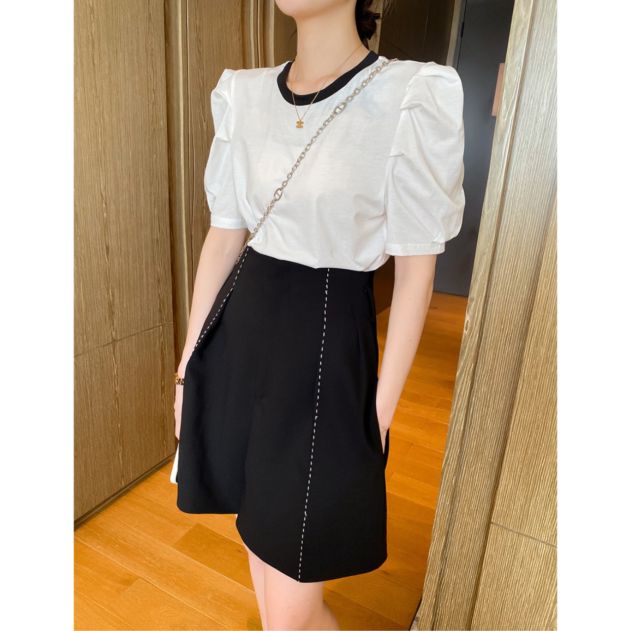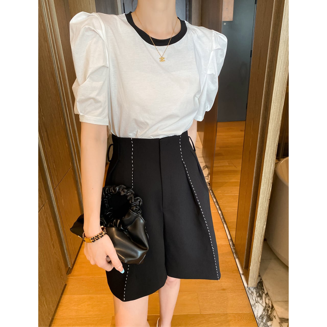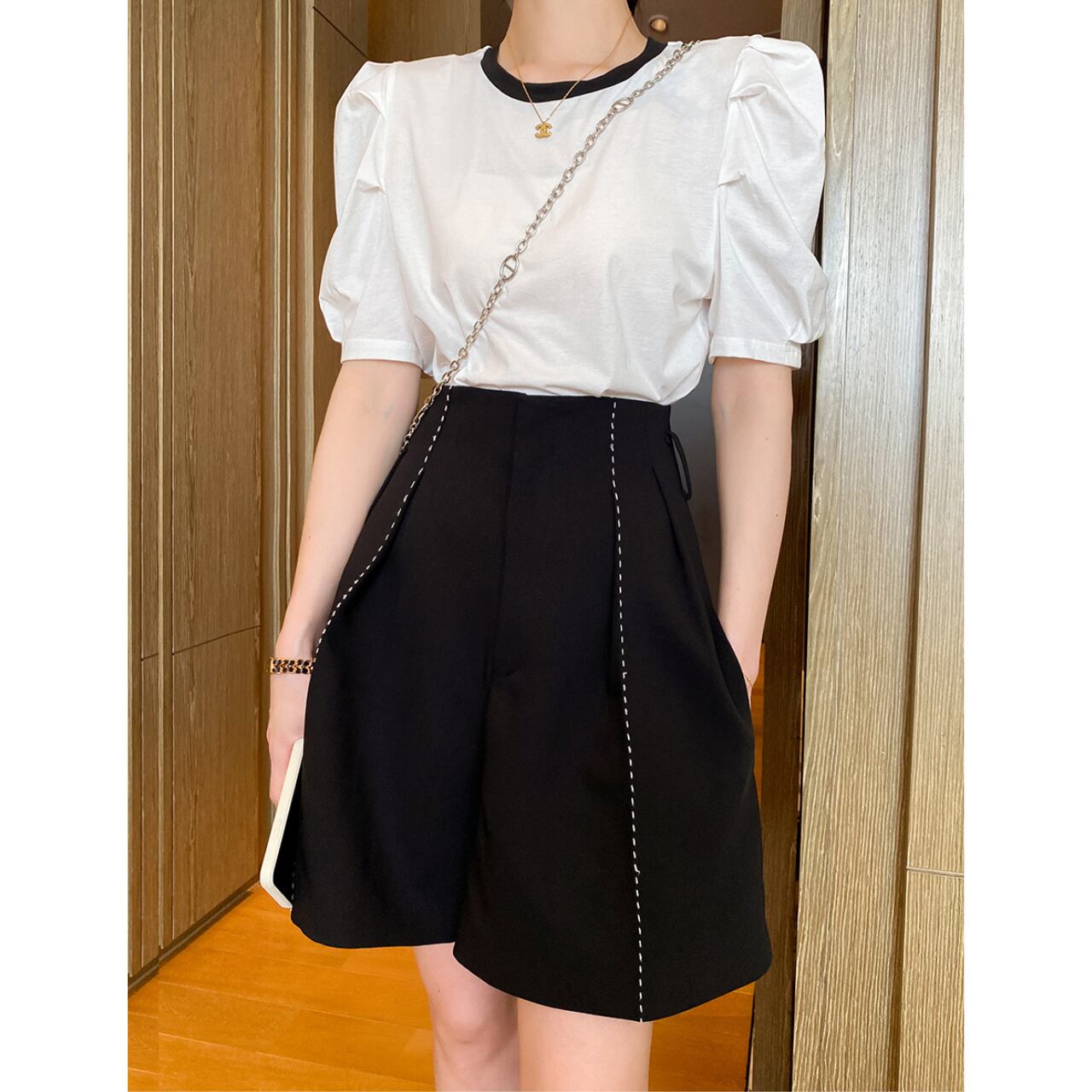 パフスリーブが女性らしい魅力を引き立てる半袖Tシャツ。