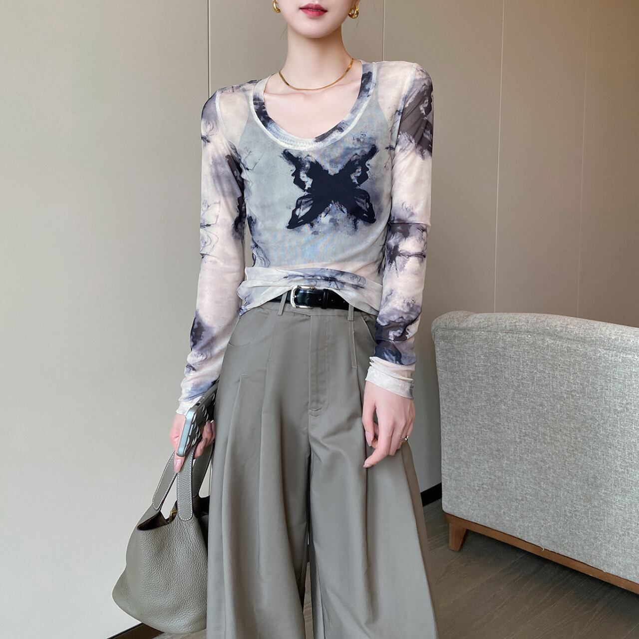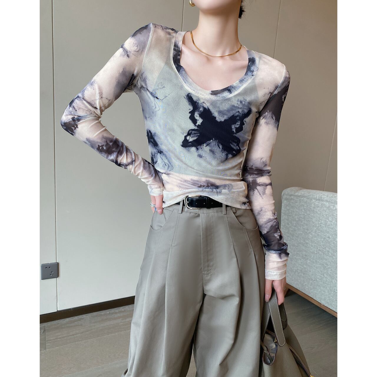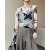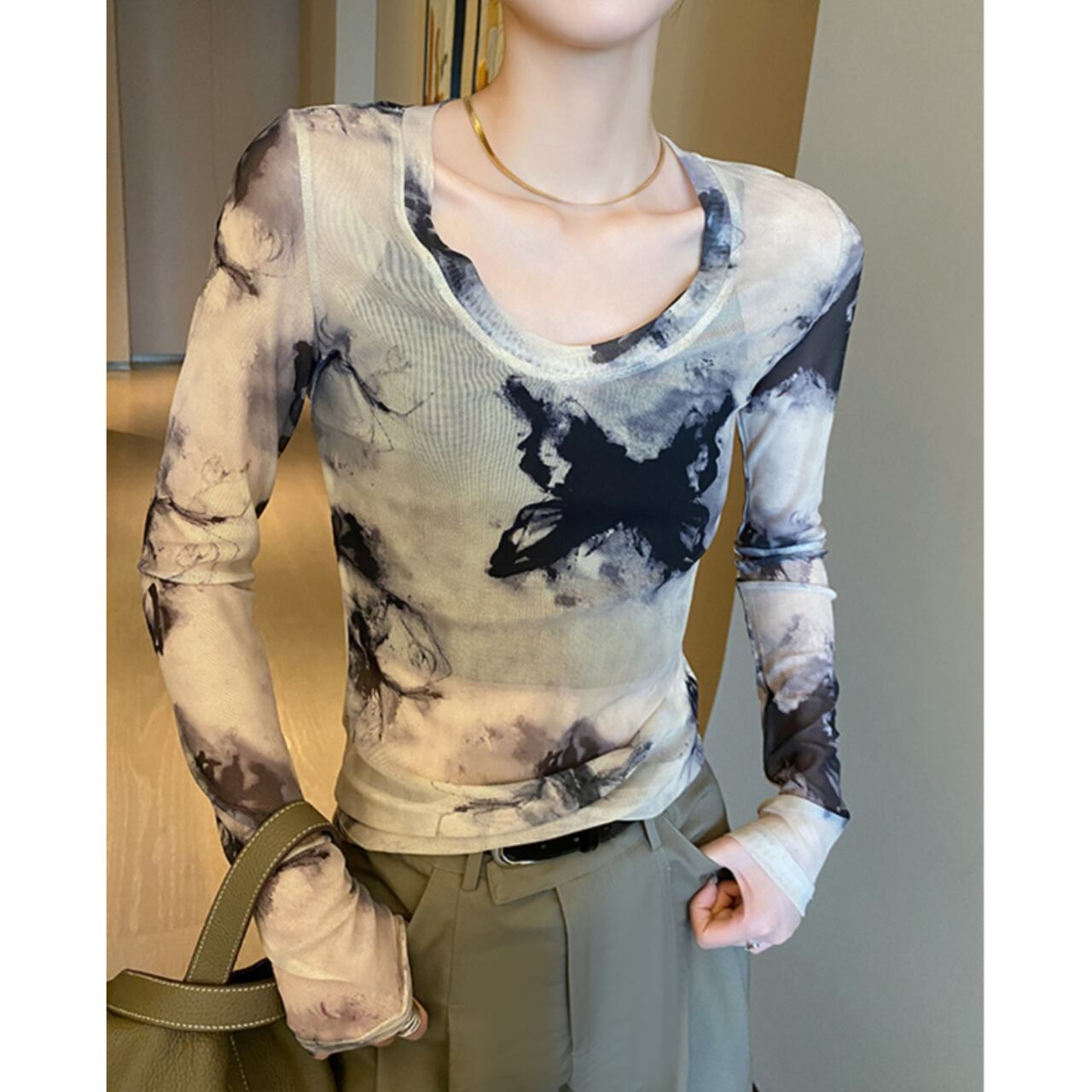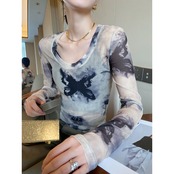 透け感のあるメッシュ素材と、目を惹くタイダイ柄が特徴的なロングスリーブトップ。