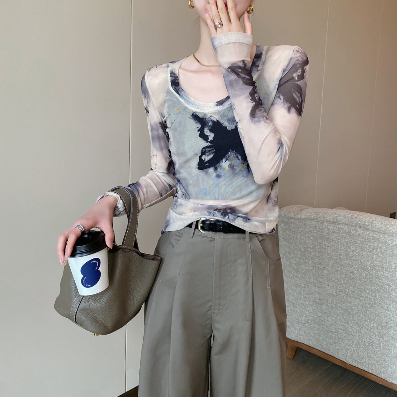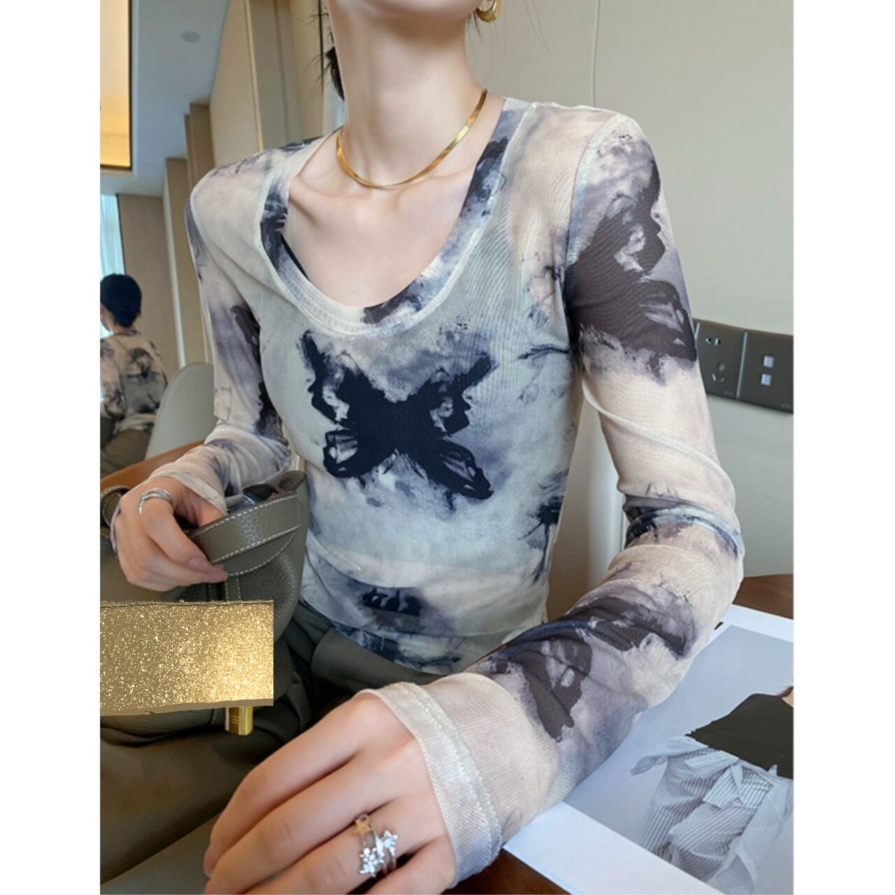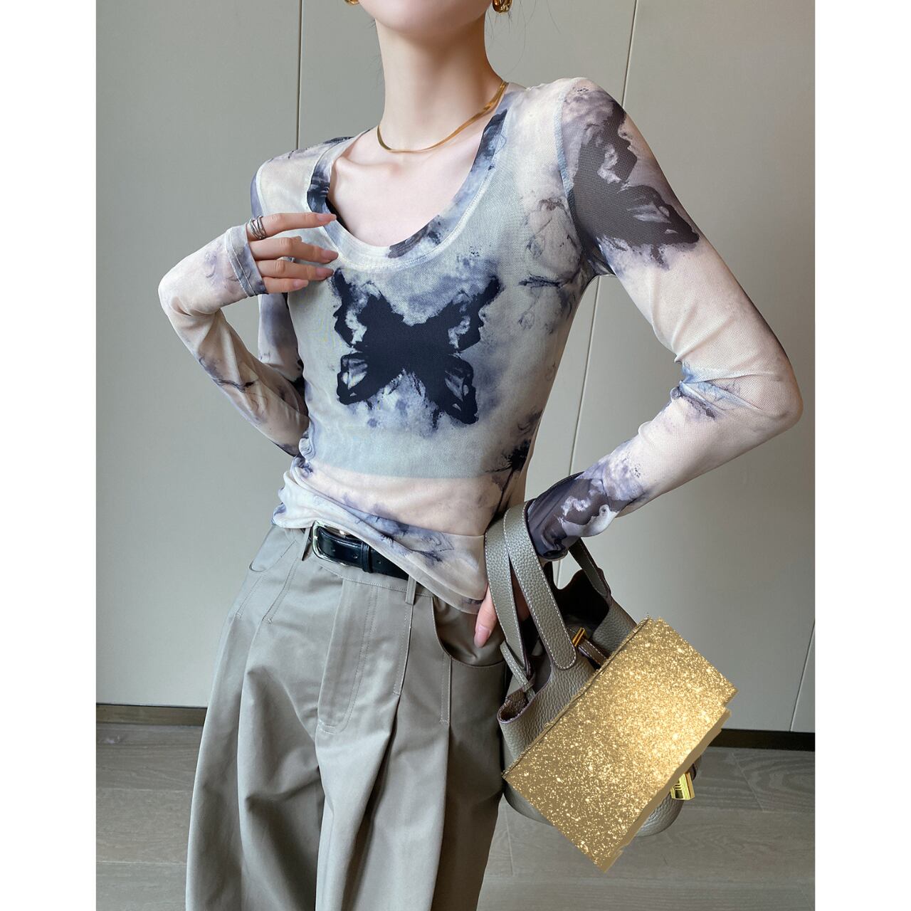 透け感のあるメッシュ素材と、目を惹くタイダイ柄が特徴的なロングスリーブトップ。