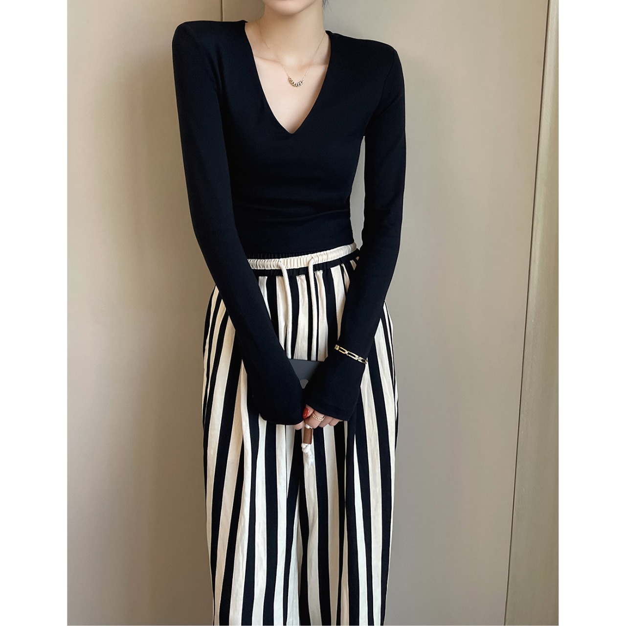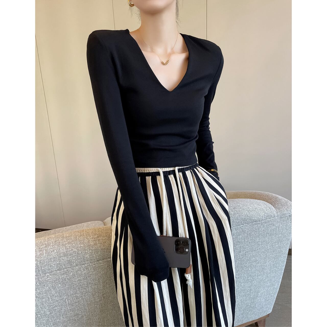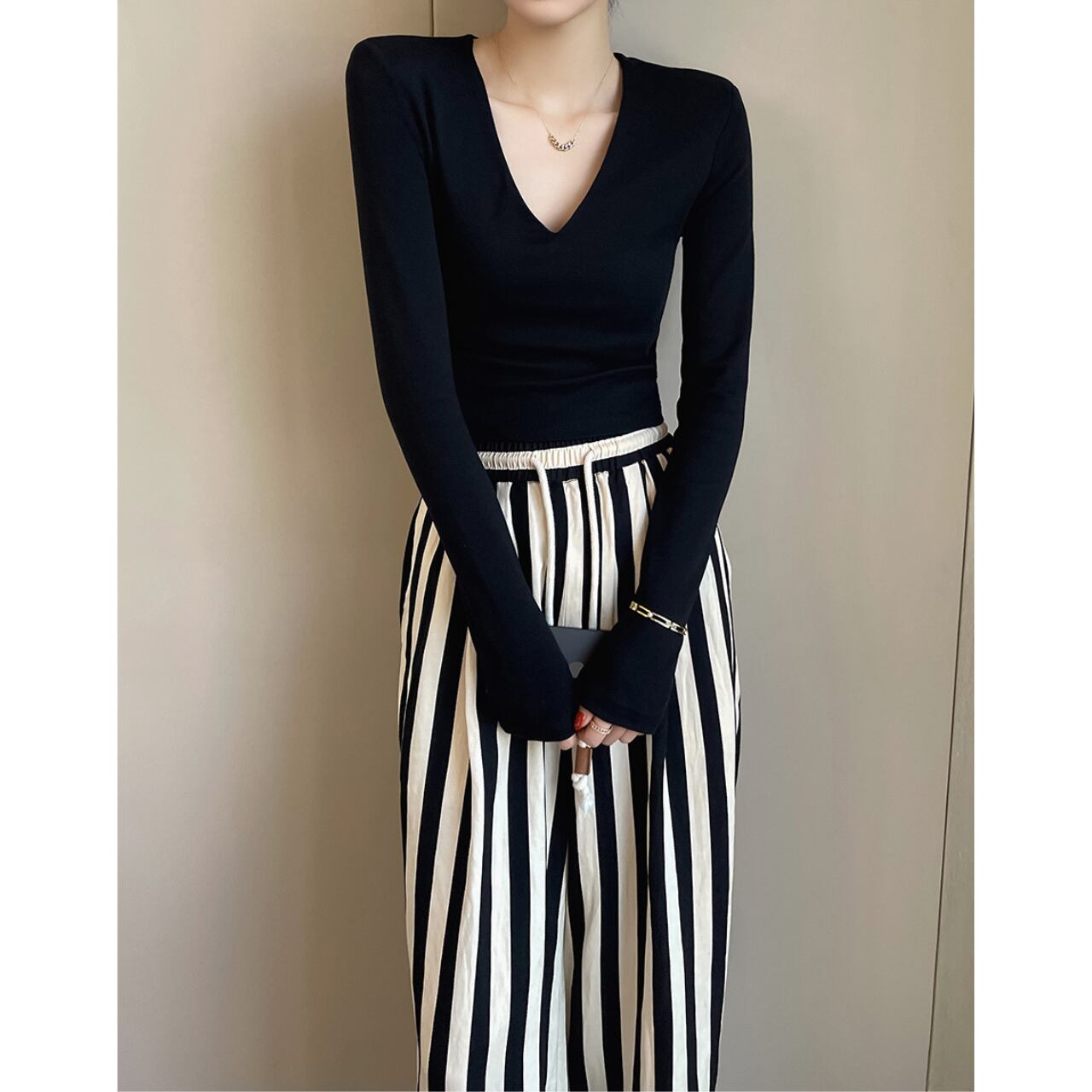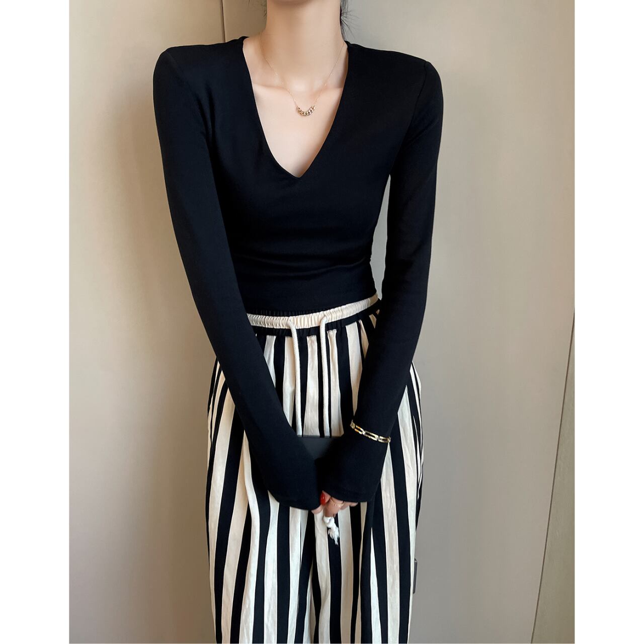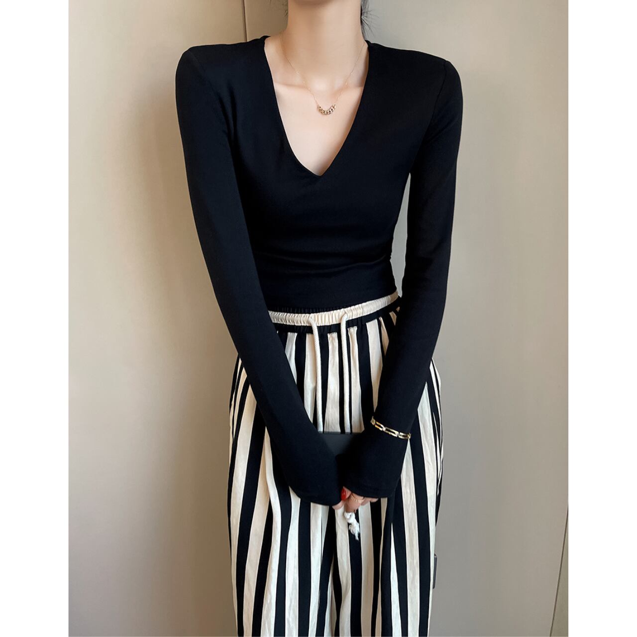 深めのVネックとロングスリーブが女性らしいシルエットを生み出すタイトフィットトップス。