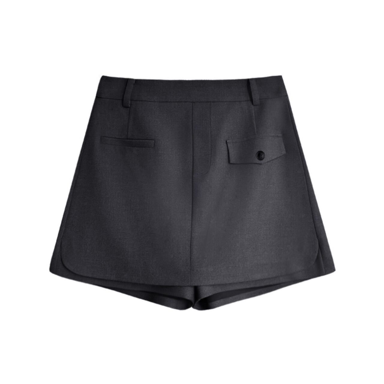 脚長効果と女性らしさを両立したハイウエストのミニスカート風パンツ。