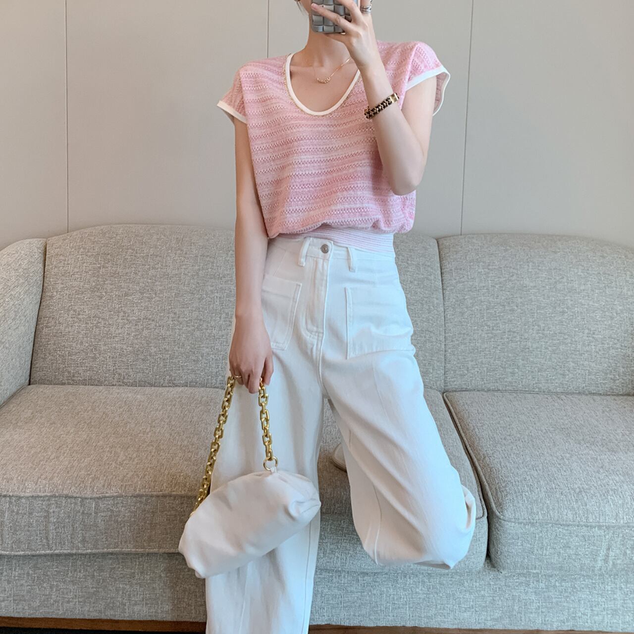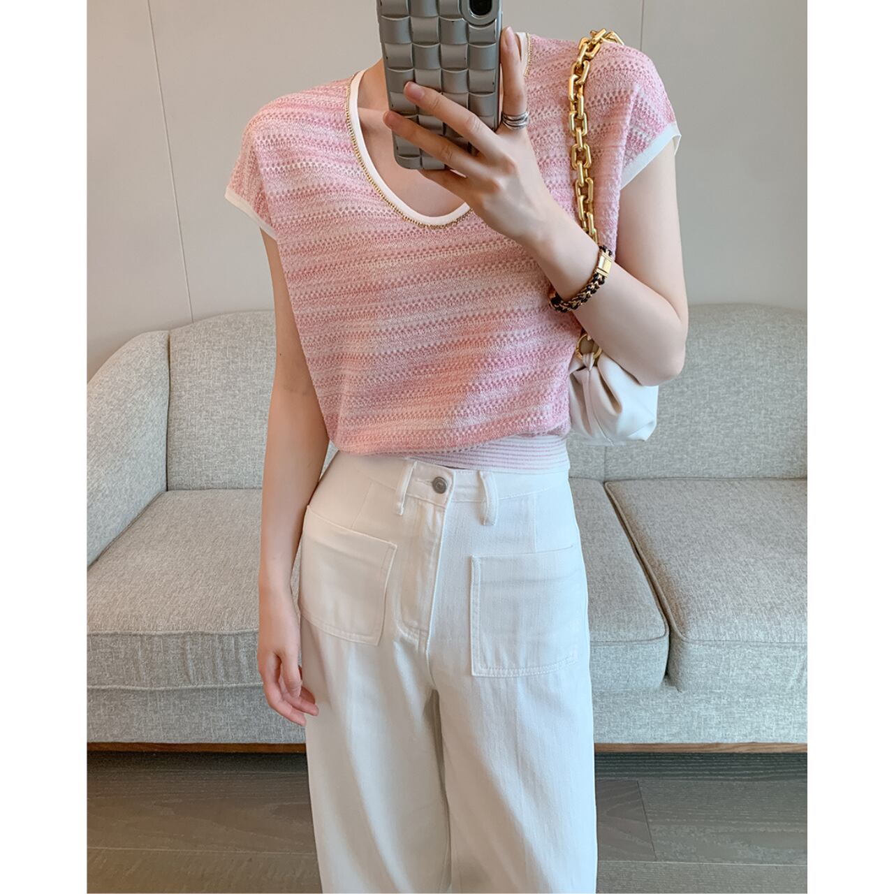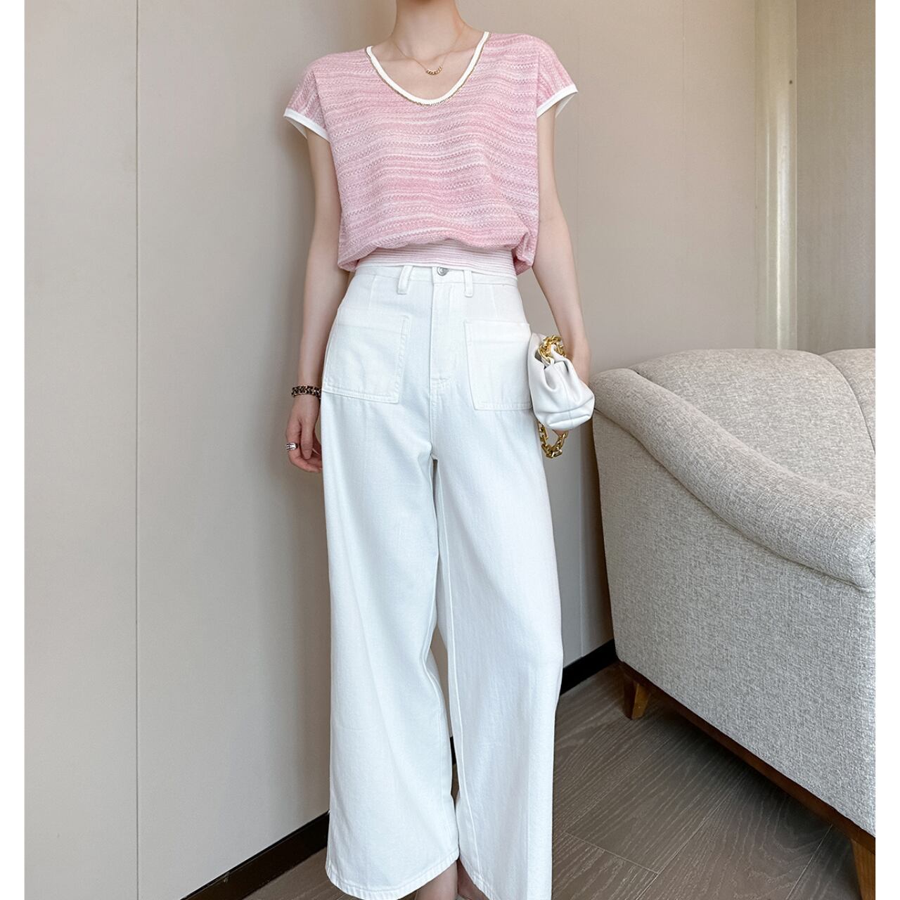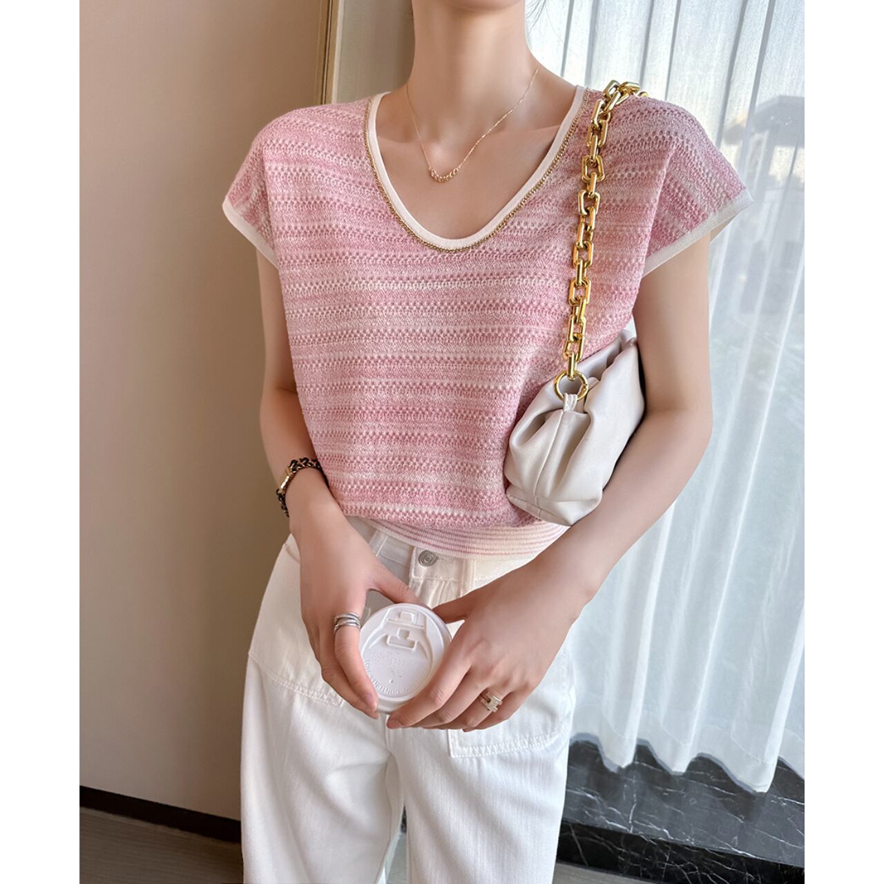 クルーネックと短めの袖丈が特徴の、すっきりとしたシルエットのニットTシャツ。