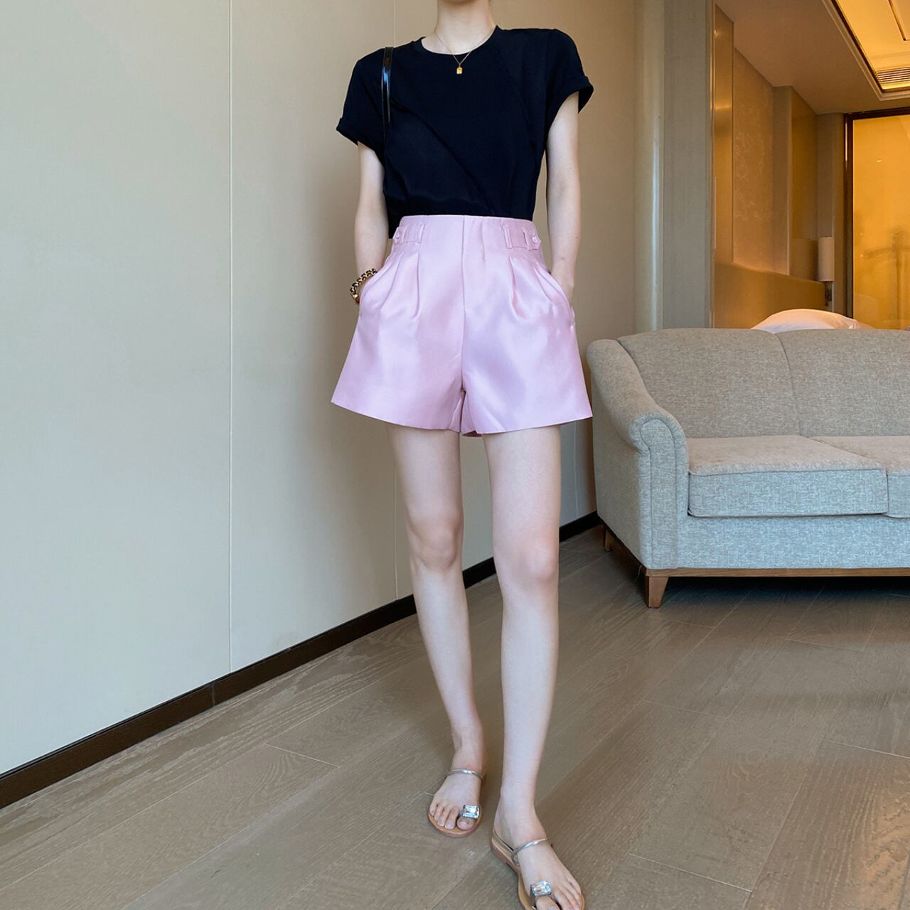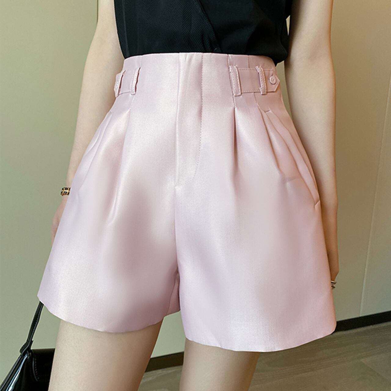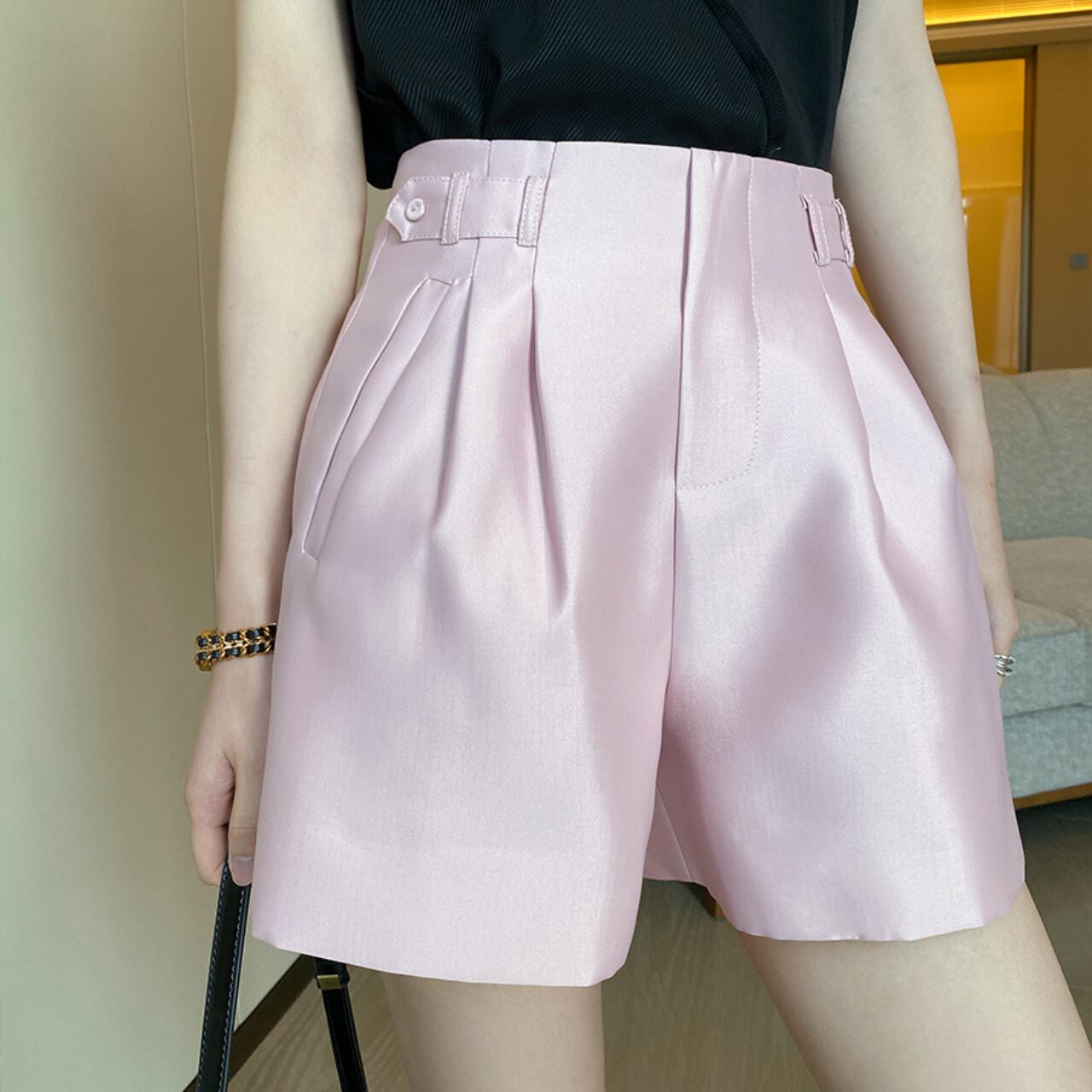 上品な光沢が魅力のワイドレッグショートパンツ。
