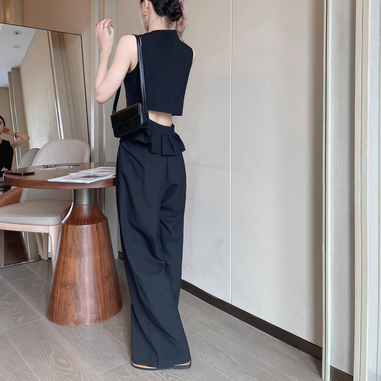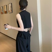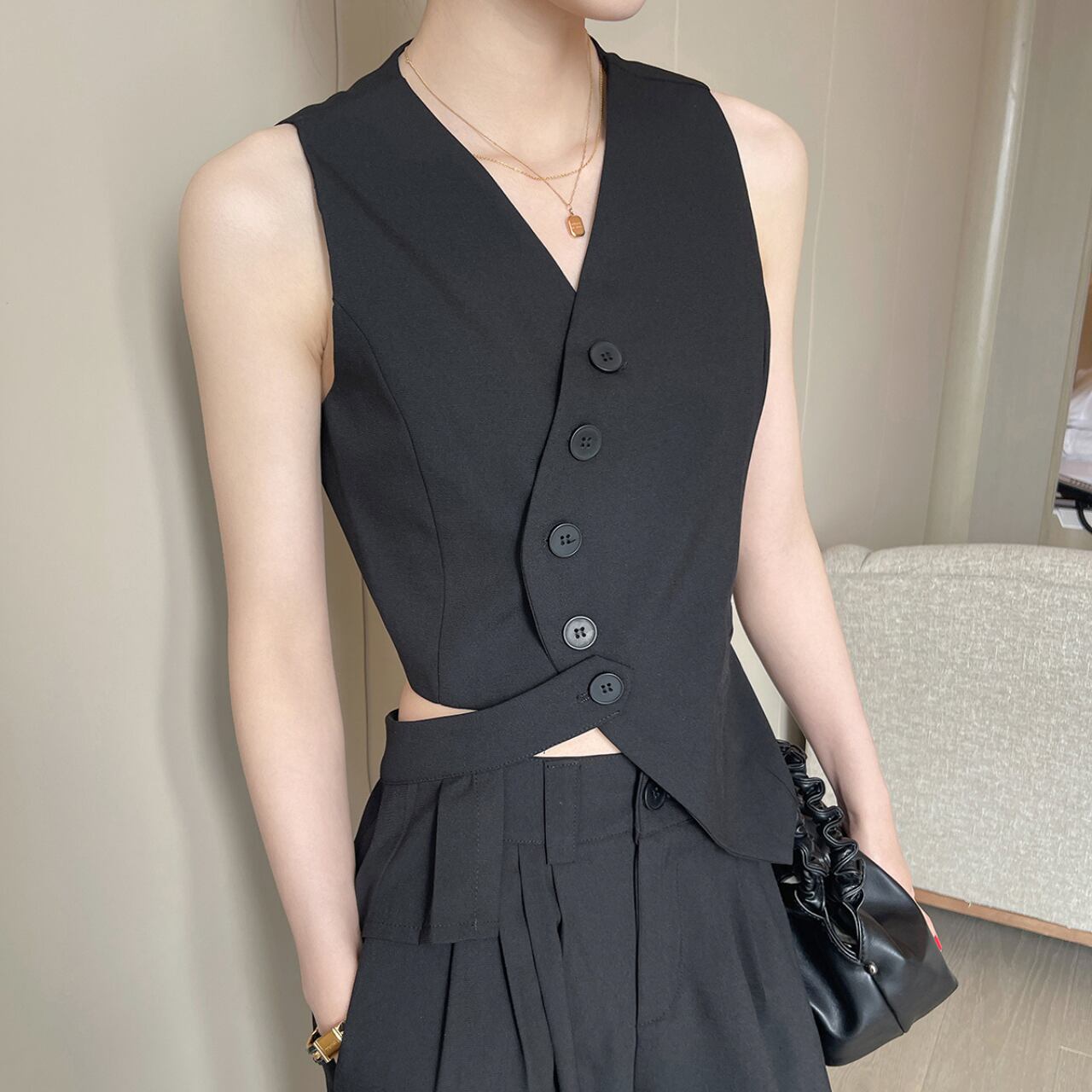 フロントボタンが特徴的なクロップド丈ベストは、シンプルながらも洗練されたデザインが魅力。