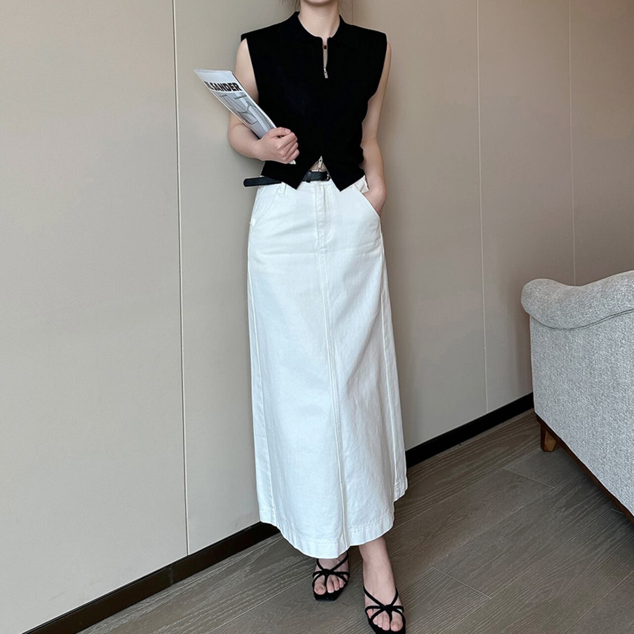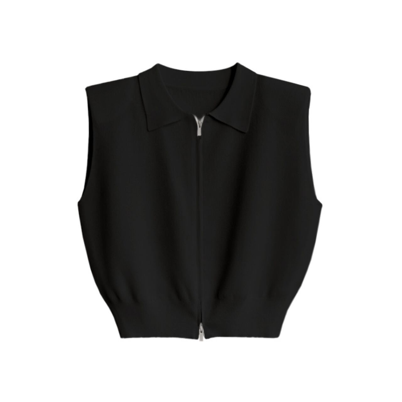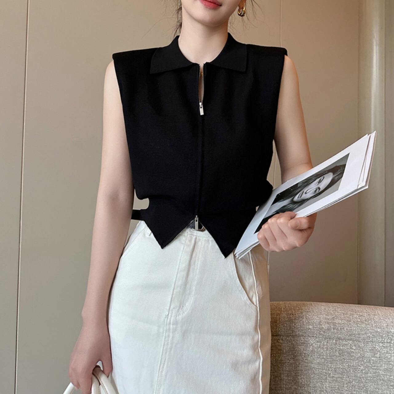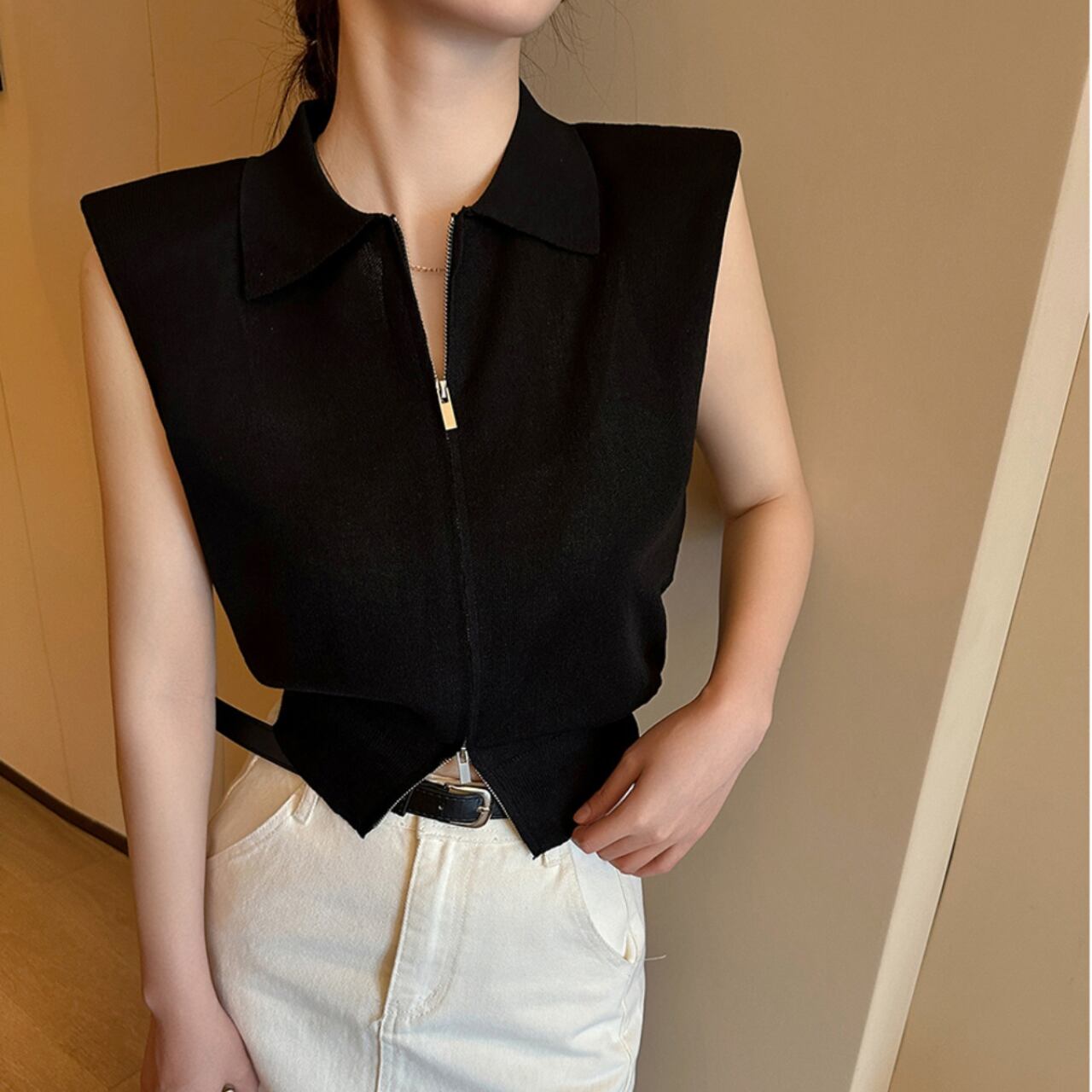 ミニマルなデザインが魅力のジップアップノースリーブベスト。