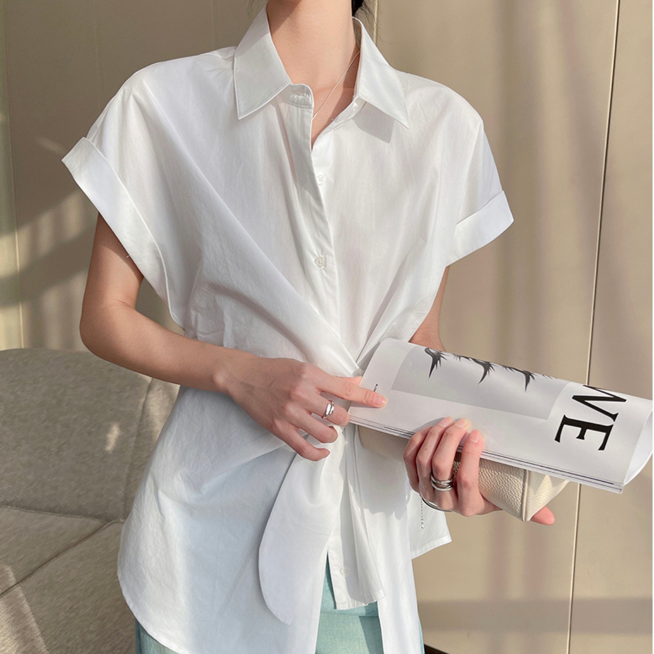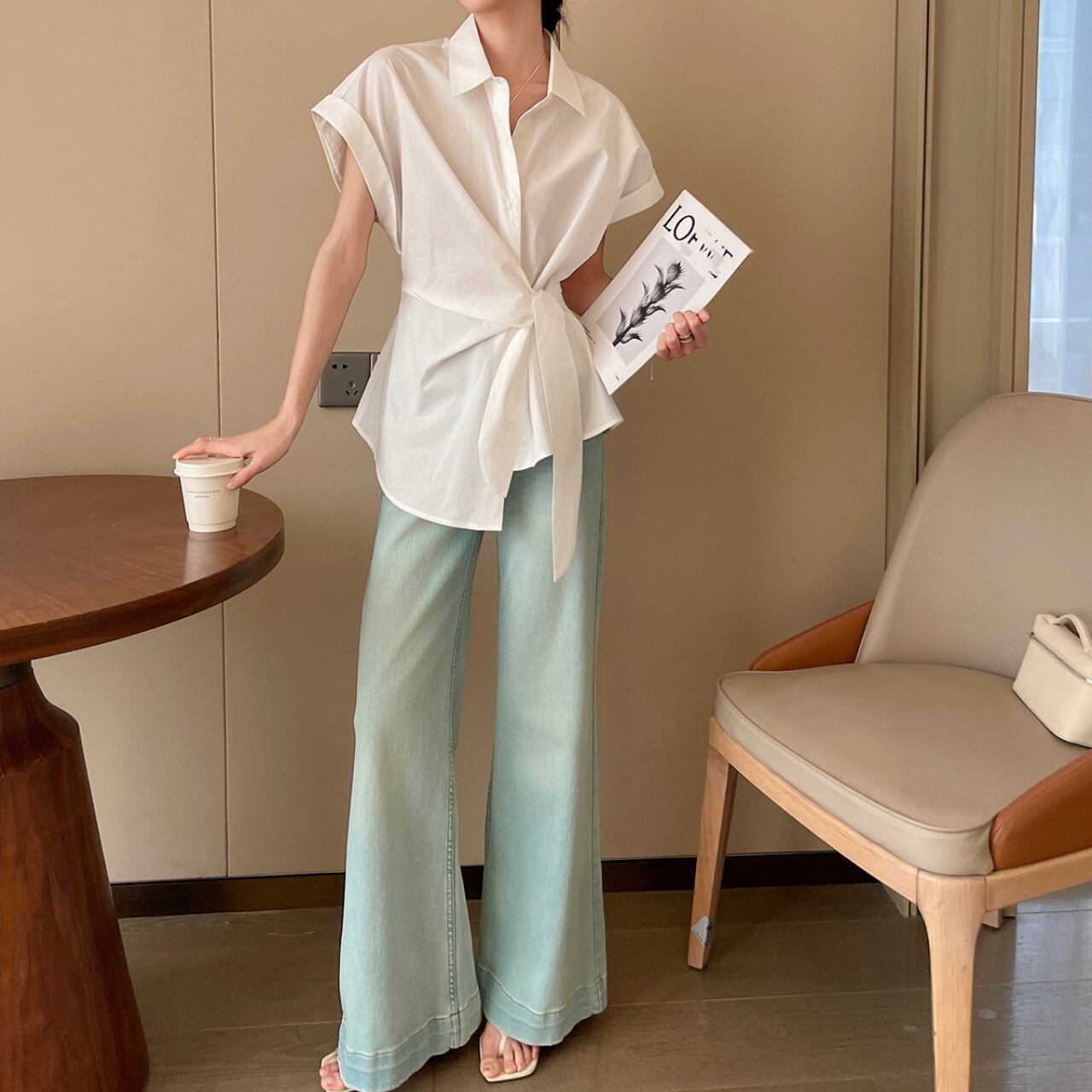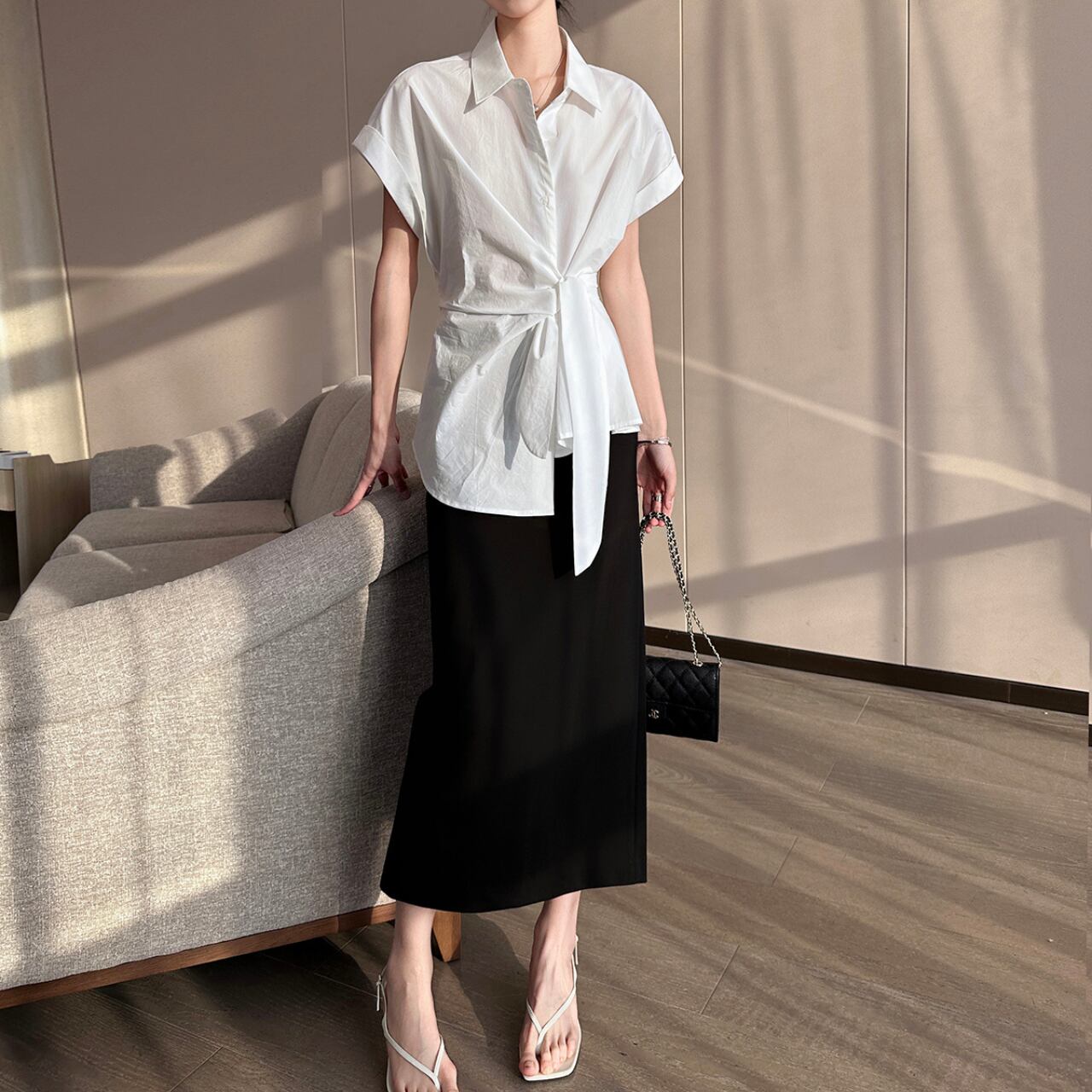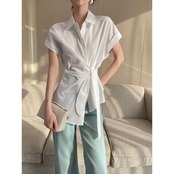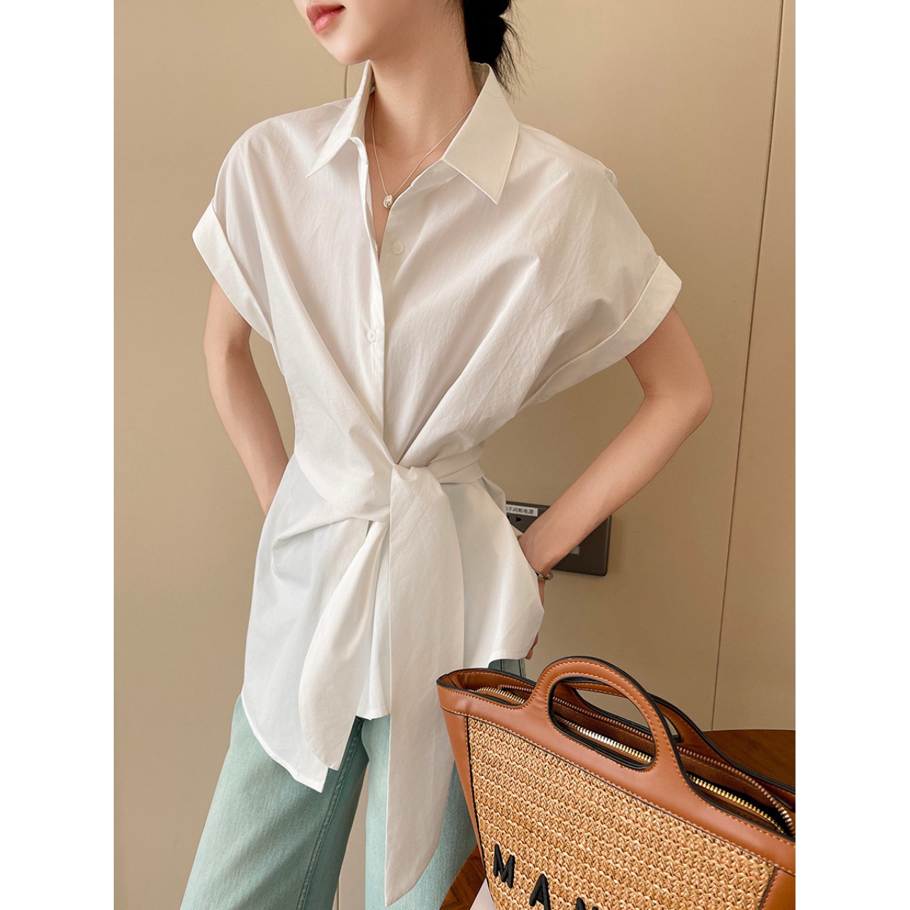 ショート丈の半袖シャツは、ウエストのリボンでキュッと絞ることで、メリハリのあるシルエットが完成します。