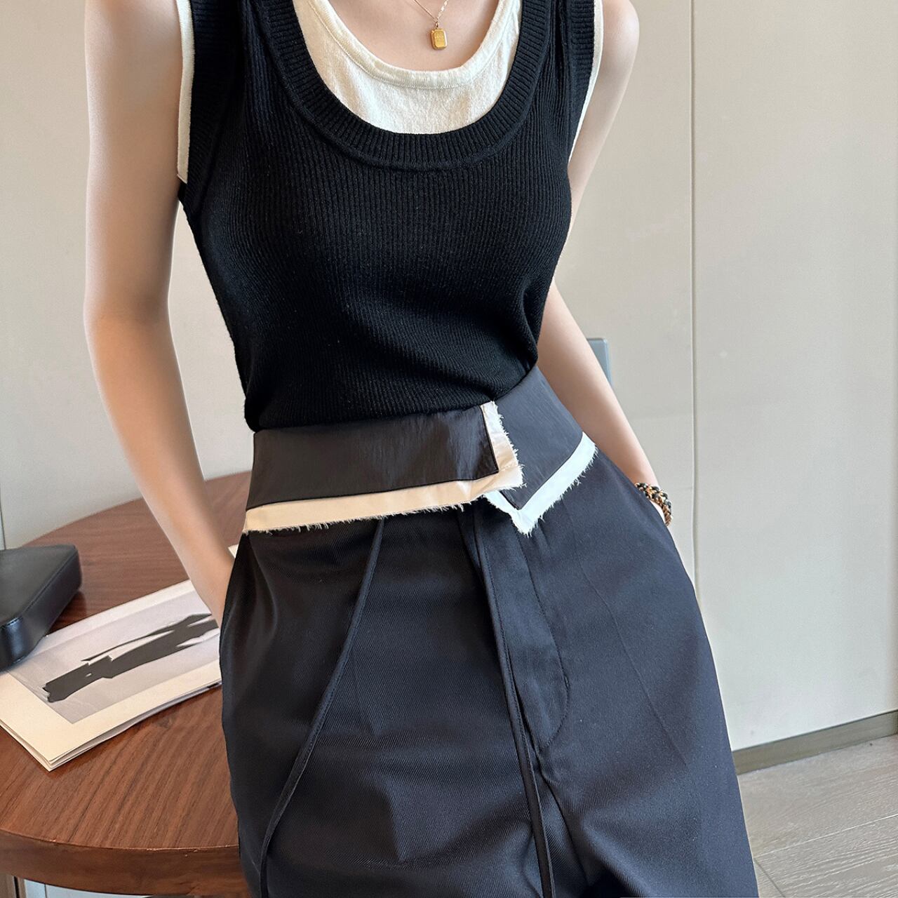 ウエスト部分の切り替えデザインが、シンプルながらも個性を放ちます。