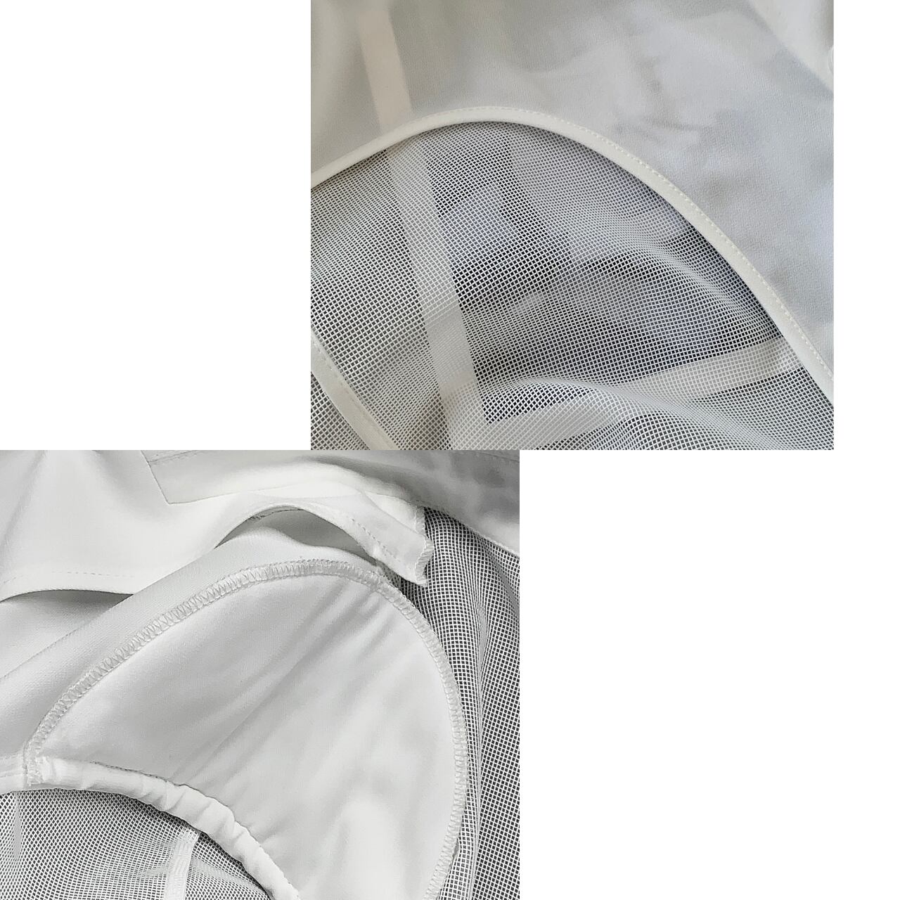 上品なダブルブレストジャケットに、メッシュ素材を組み合わせた斬新なデザイン。