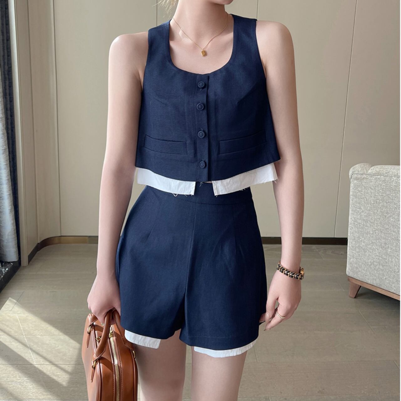 上品な雰囲気を醸し出すクロップドベスト。