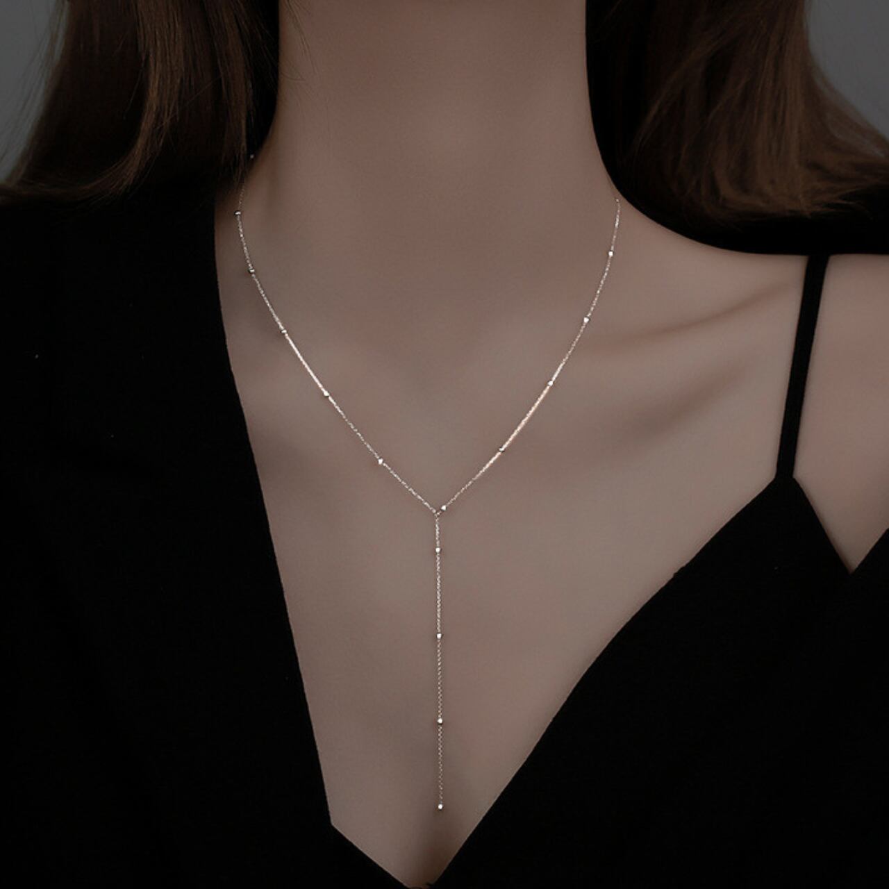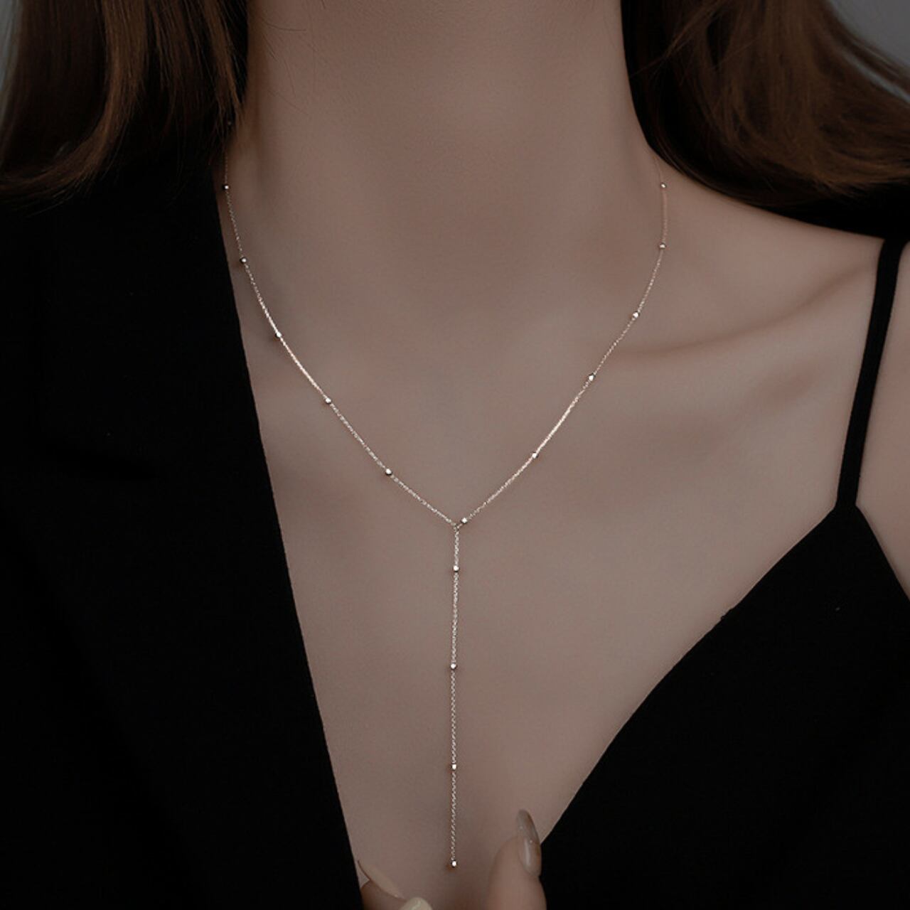 Y字のデザインがデコルテラインを美しく魅せ、さりげない輝きが洗練された印象を与えます。