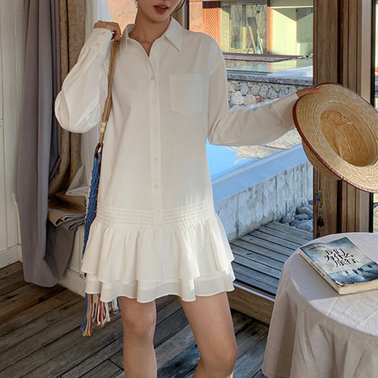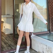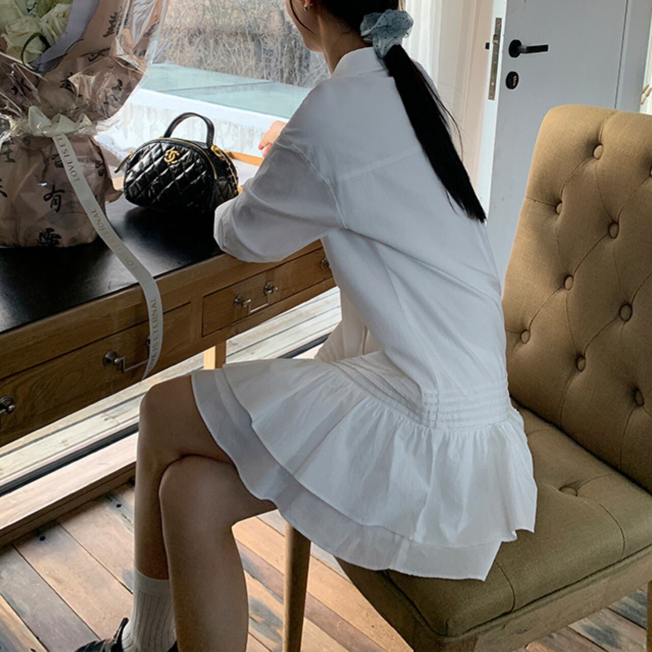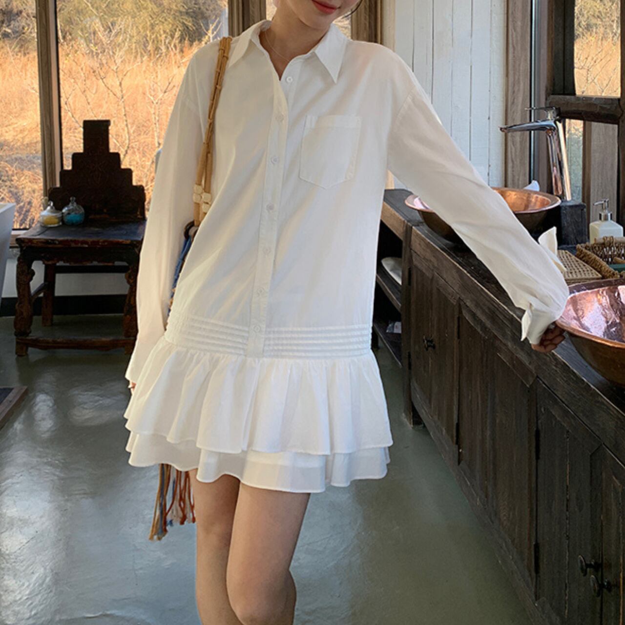 シャツ×フリルで甘すぎない大人可愛さを