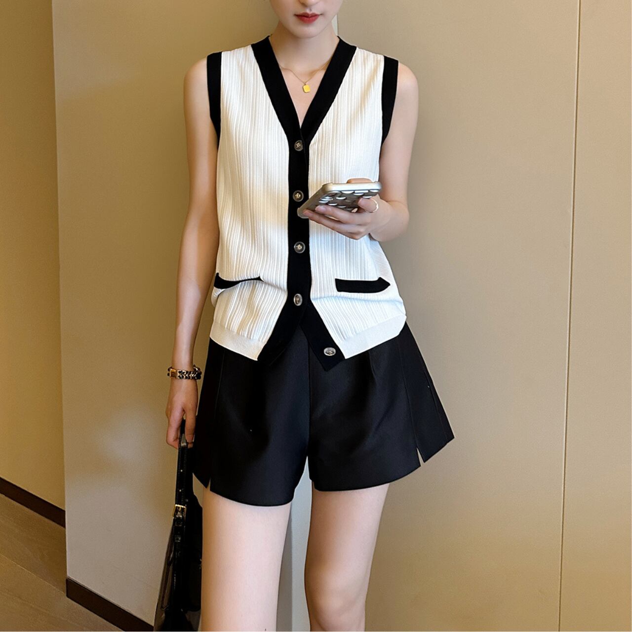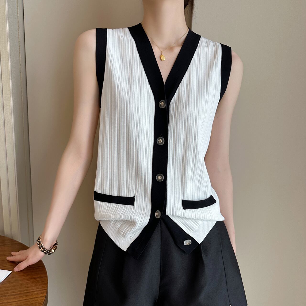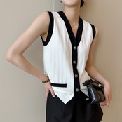 上品なバイカラーデザインが映える、大人のためのノースリーブトップス。