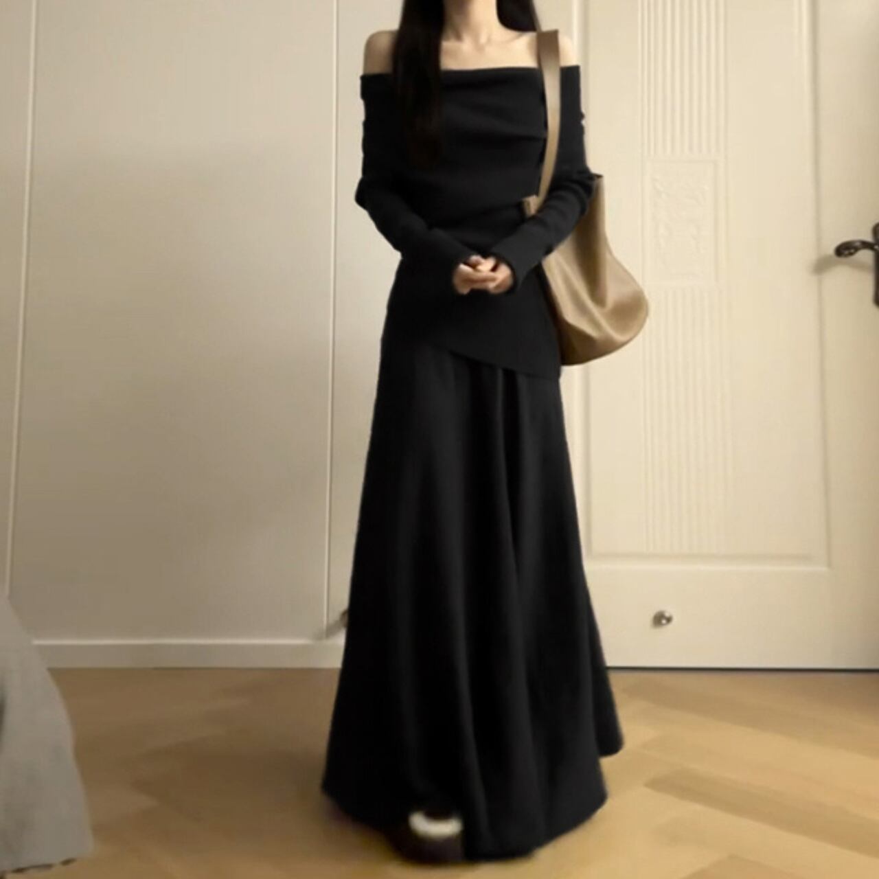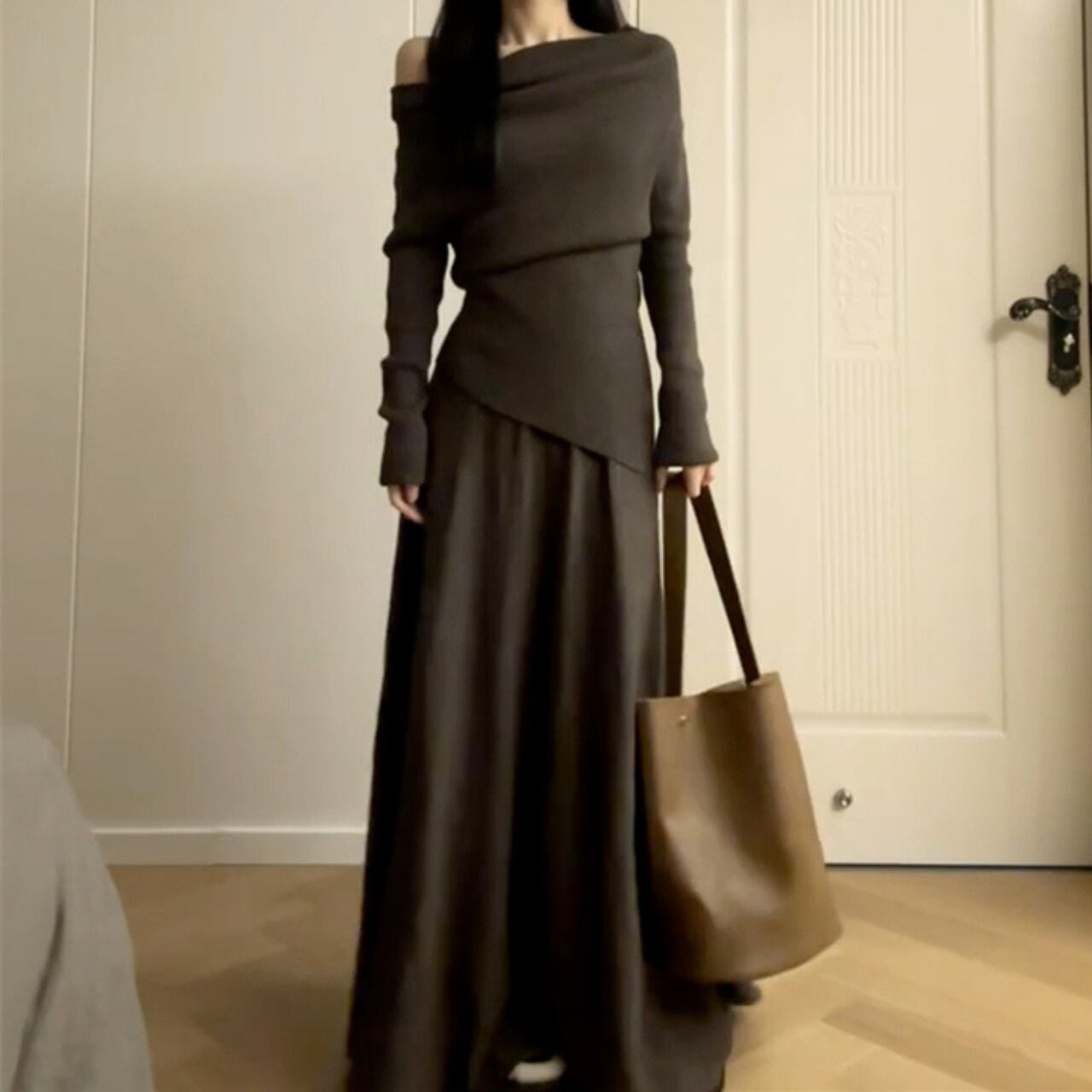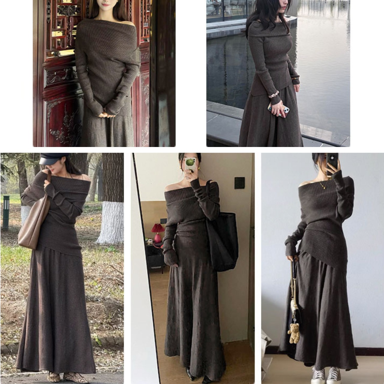 大人の女性のためのオフショルダーニットトップ&ロングスカートセット。