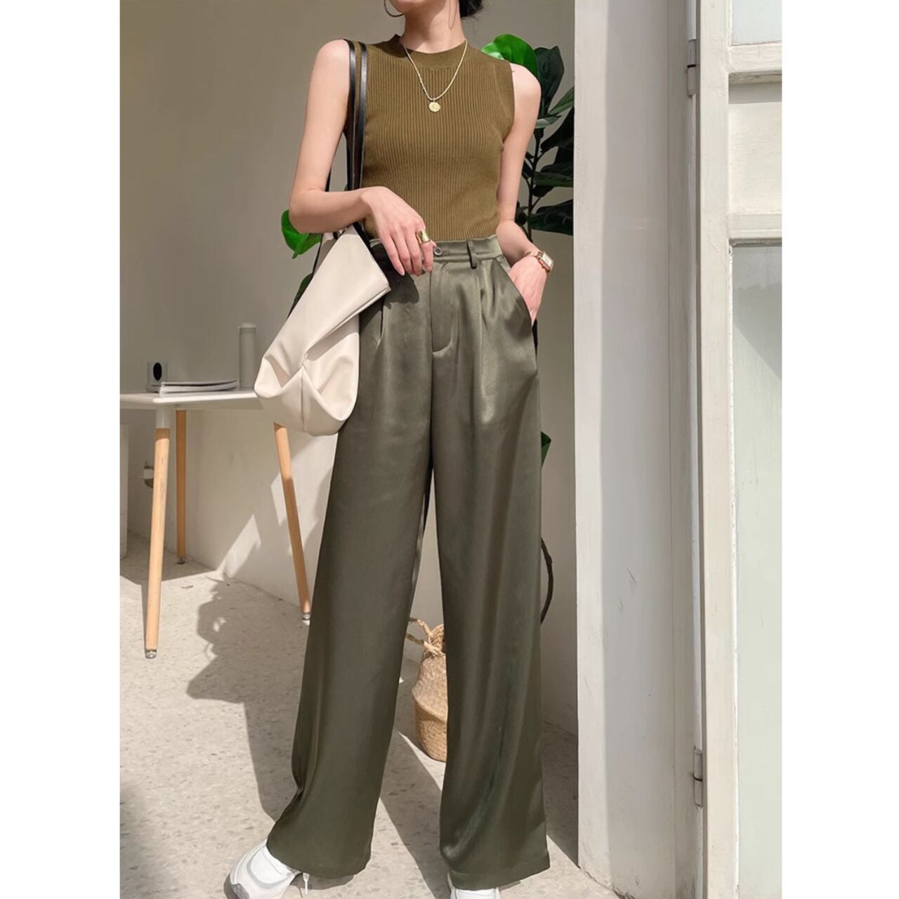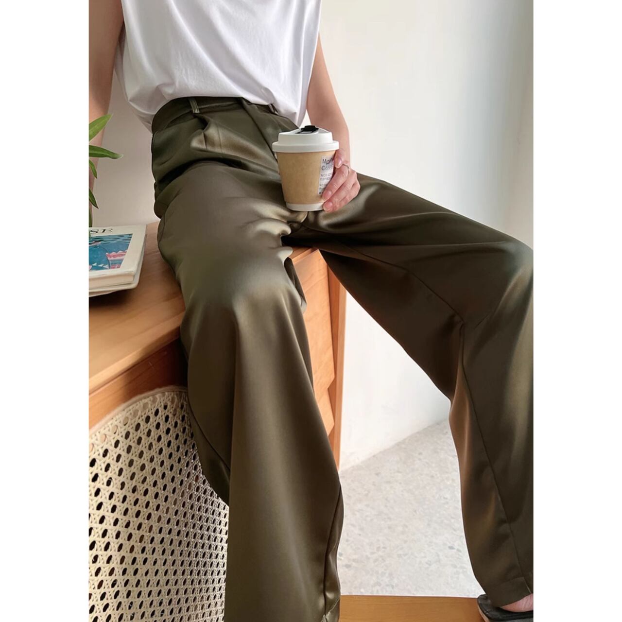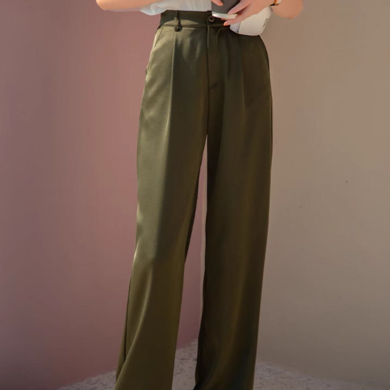 とろみ素材×上品カラーで、オフィスでも大活躍の万能パンツ。