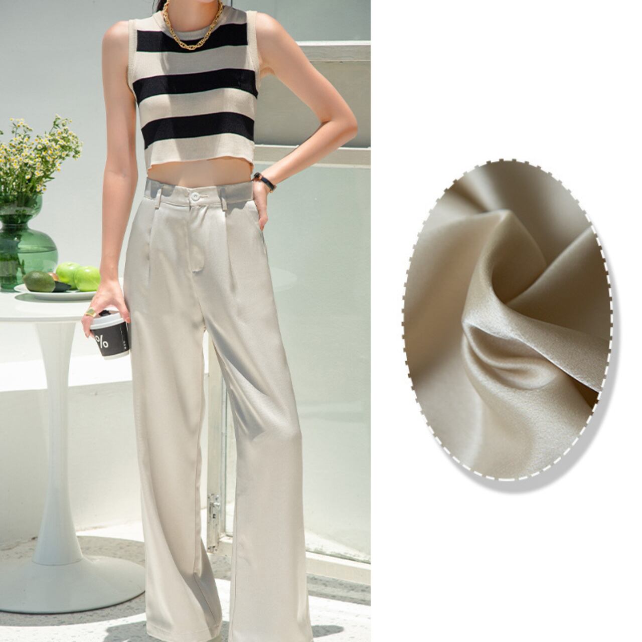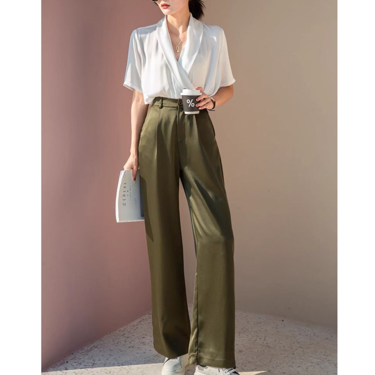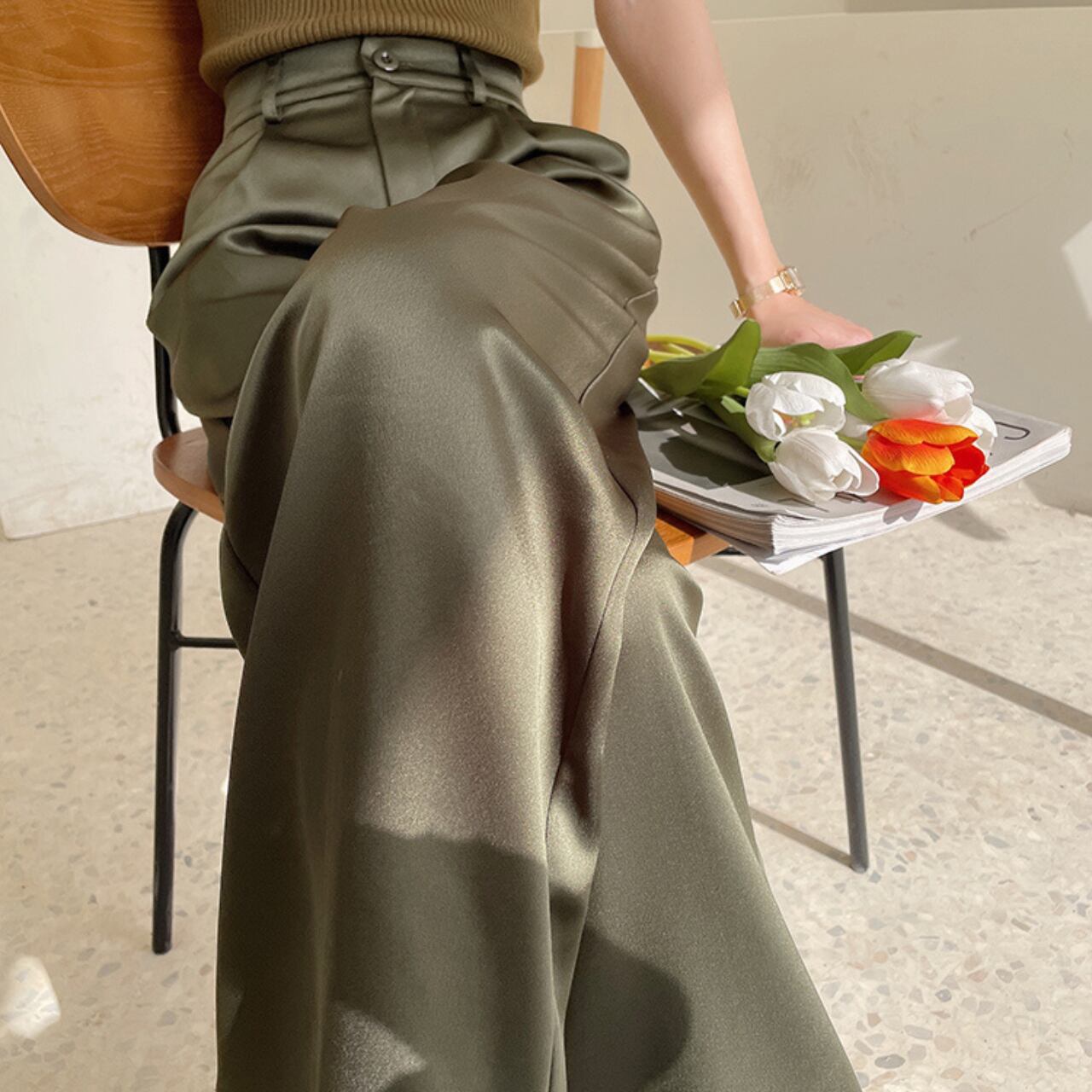 とろみ素材×上品カラーで、オフィスでも大活躍の万能パンツ。